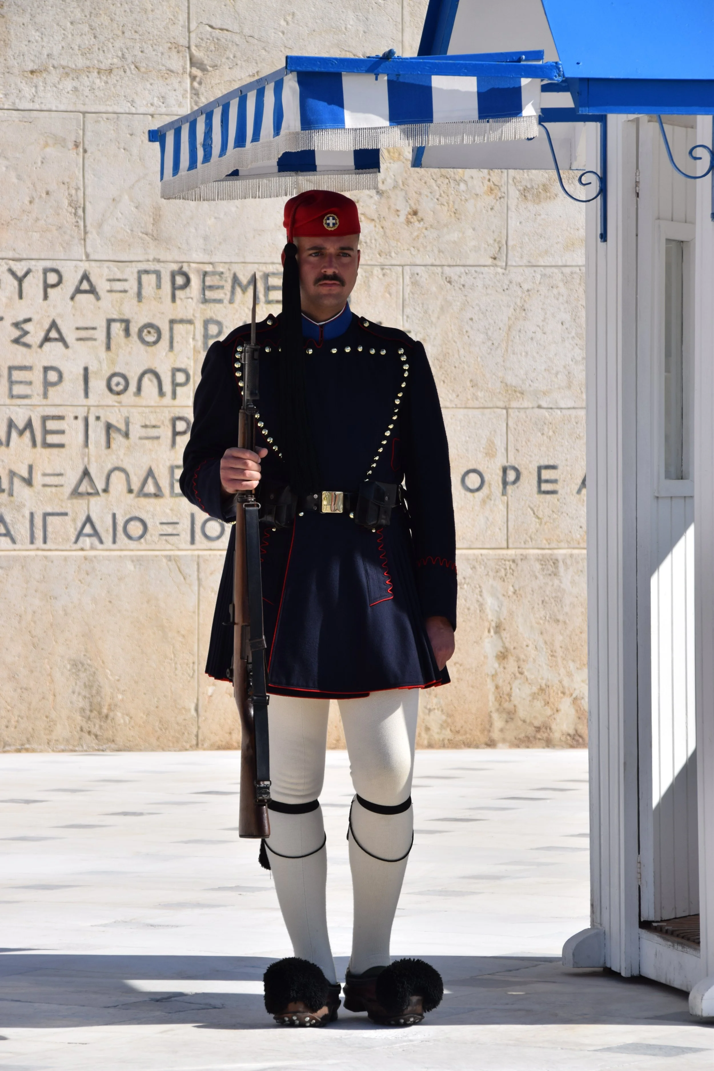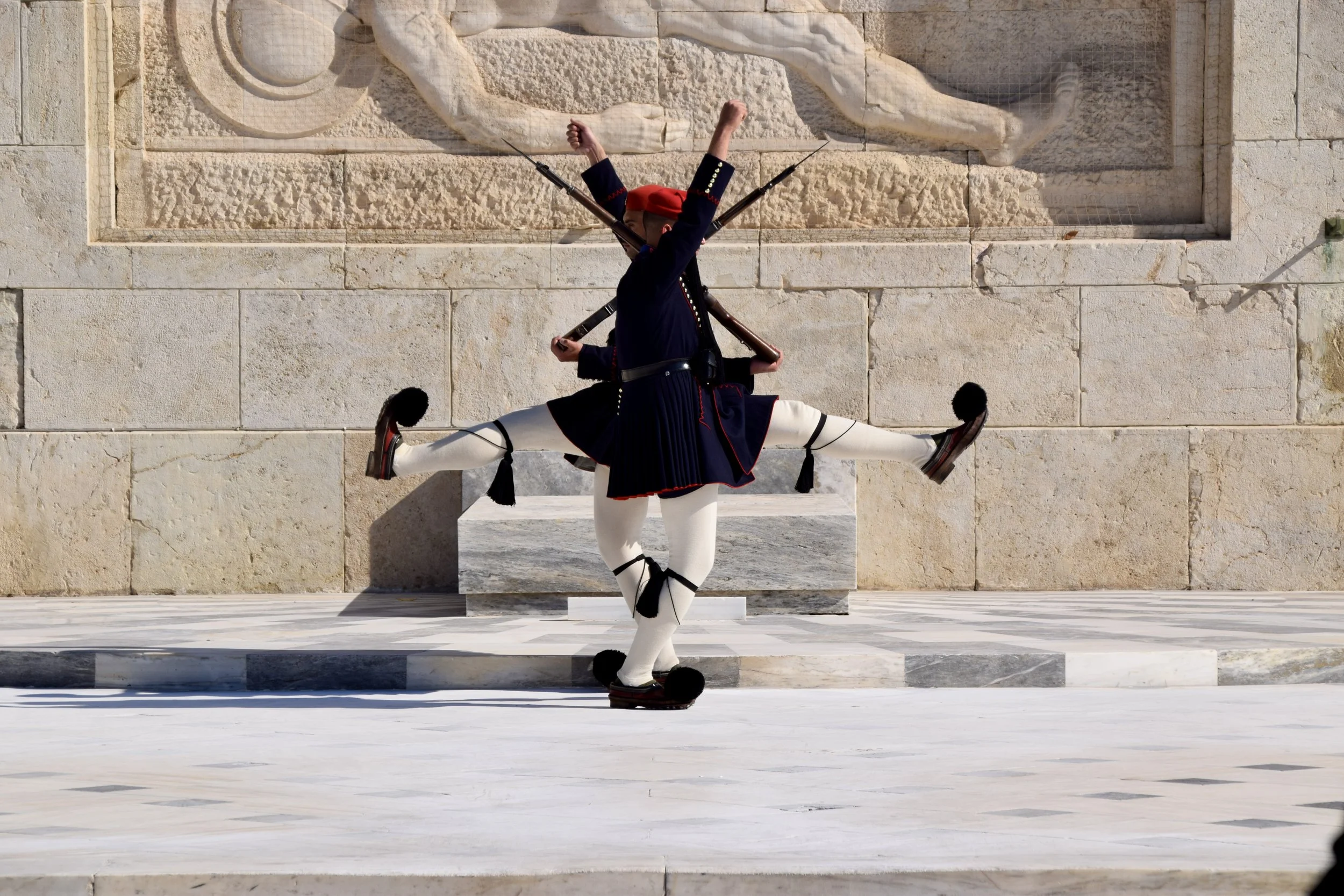 Each guard, part of a special unit of the Greek military, stands his post for one hour, during which time they must remain absolutely motionless and without expression. This takes a month of training, including special exercises where they learn to keep their bodies and minds perfectly still. At the top of the hour, the two guards are relieved until their next shift, which will be several hours later. A guard normally serves three hour-long shifts every two days. The lengthy and elaborate steps of the ritual are performed in slow motion, so as not to upset the circulatory system after being motionless for so long. While the speed and exaggerated movements are necessary, it does look a bit odd at times.