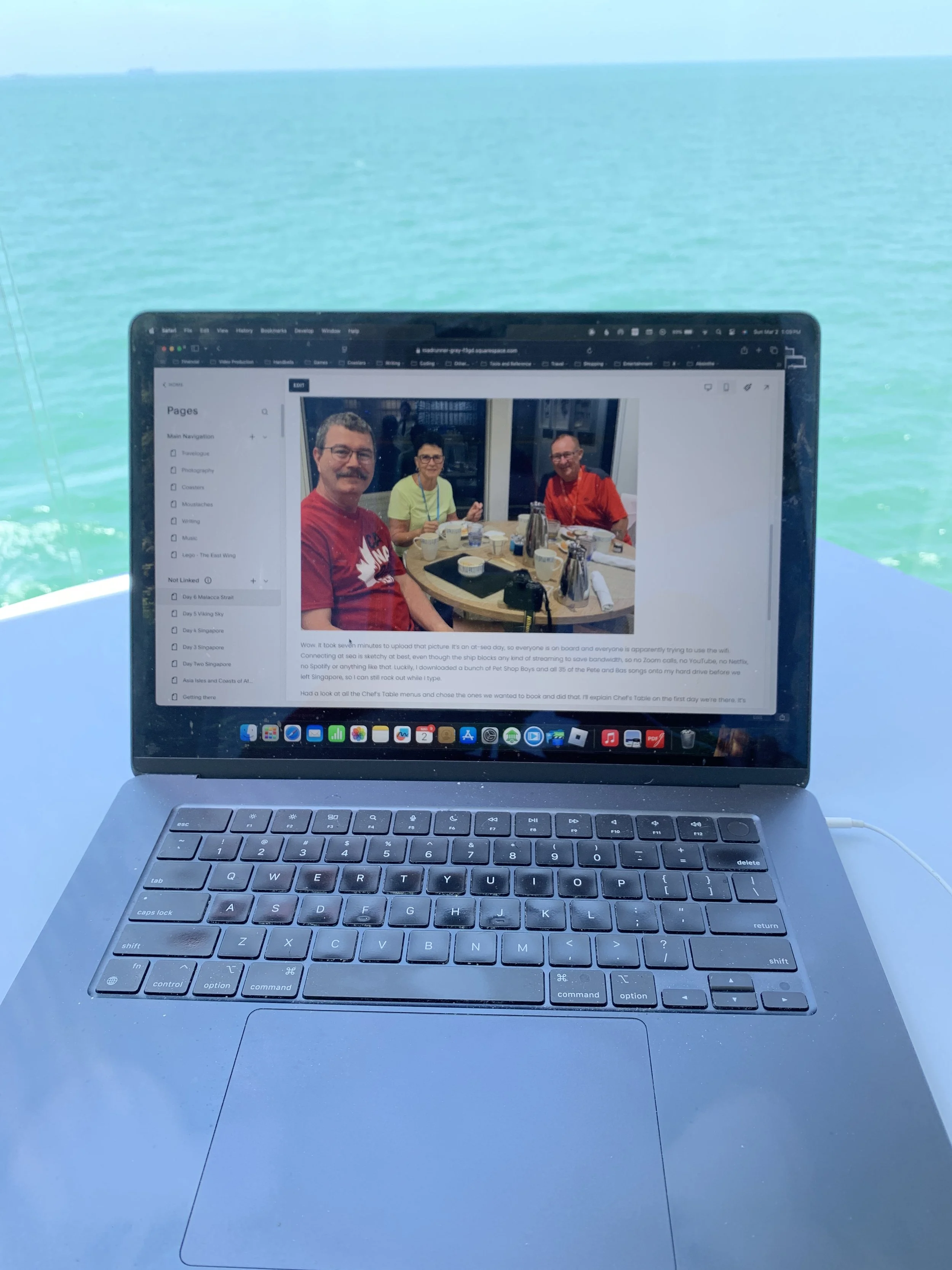 Wow. It just took seven minutes to upload that picture. It’s an at-sea day, so everyone is on board and everyone is apparently trying to use the wifi. Connecting at sea is sketchy at best, even though the ship blocks any kind of streaming to save bandwidth, so no Zoom calls, no Netflix, no HBO or anything like that. Luckily, I downloaded a bunch of Pet Shop Boys and all 35 of the Pete and Bas songs onto my hard drive before we left Singapore, so I can still rock out while I type.