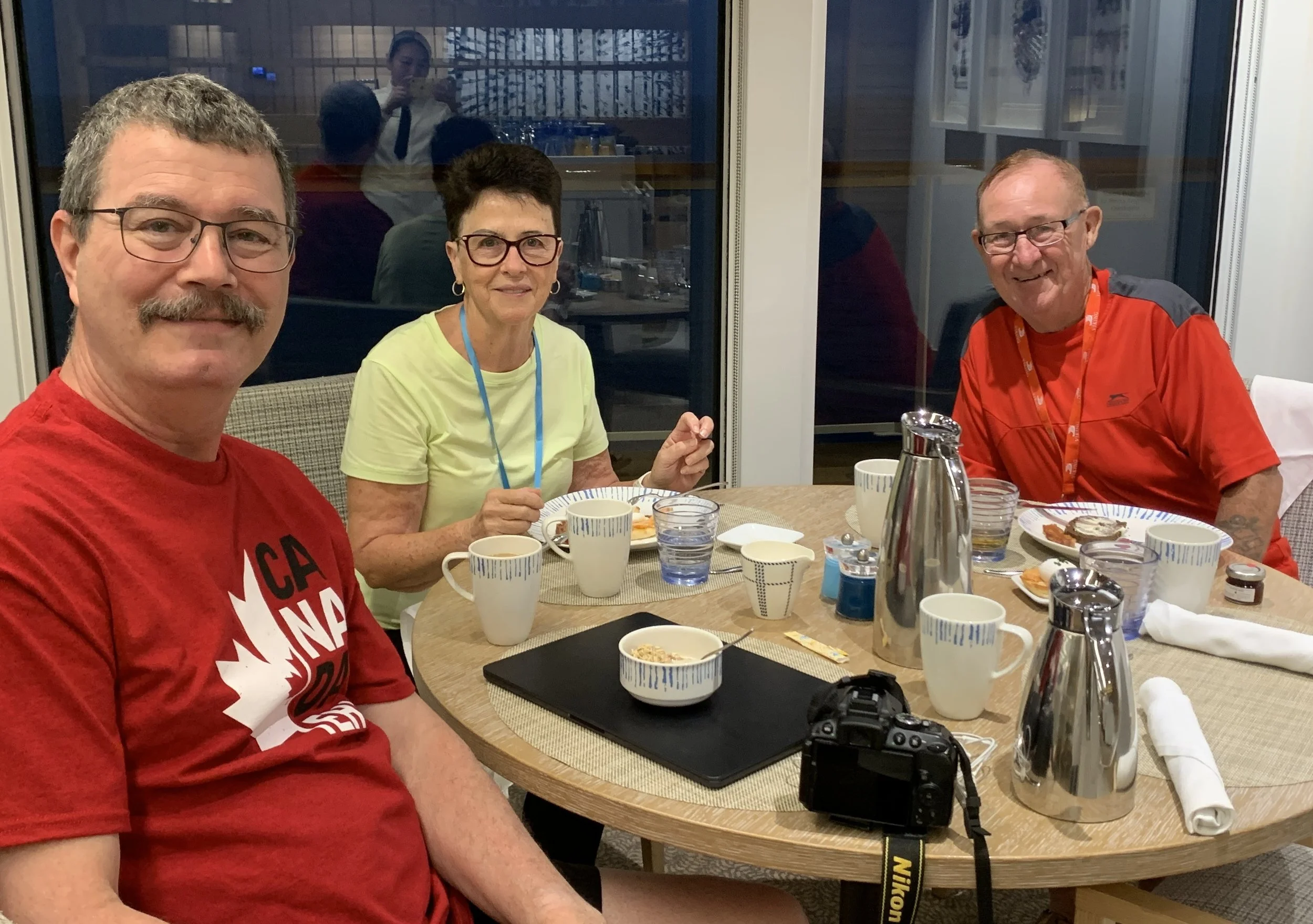 Woke up in the morning and sat at my usual spot, along the window at the World Café near the coffee machine, and remembered the Marco Polo cruise we did a few years ago, when I’d sit in this spot, usually the only one in the place, and Doug and Heather, an Aussie couple, would be the next ones in and they’d sit at the round table in the corner. They were super-fun and I missed seeing them on other cruises… and then they walked in and sat in their usual spot! What a great surprise!