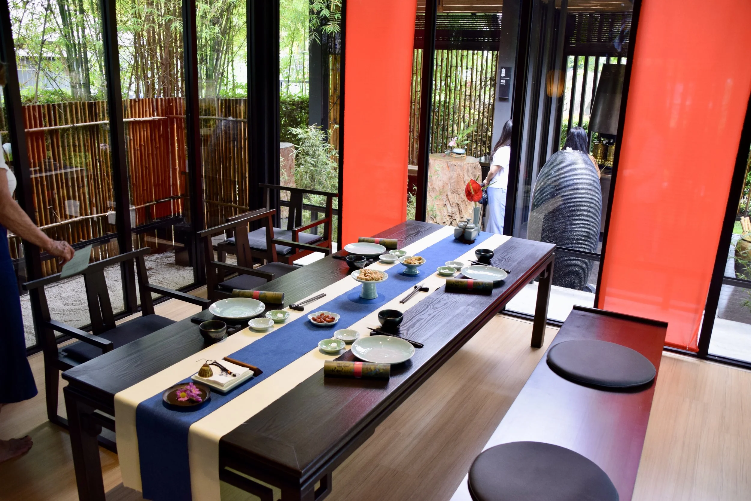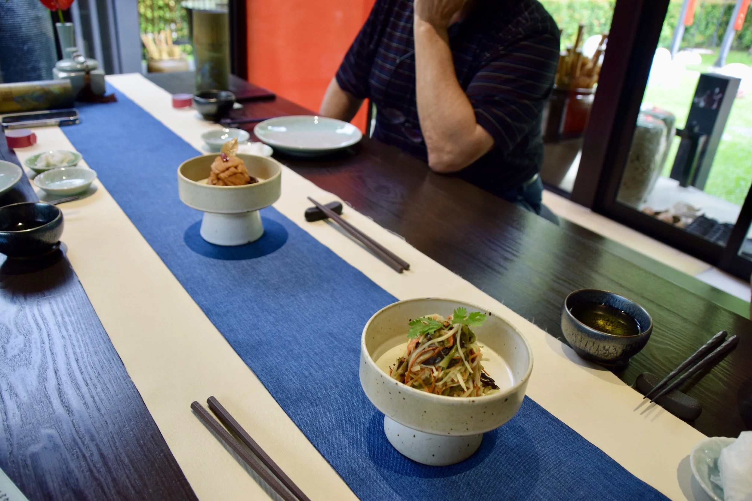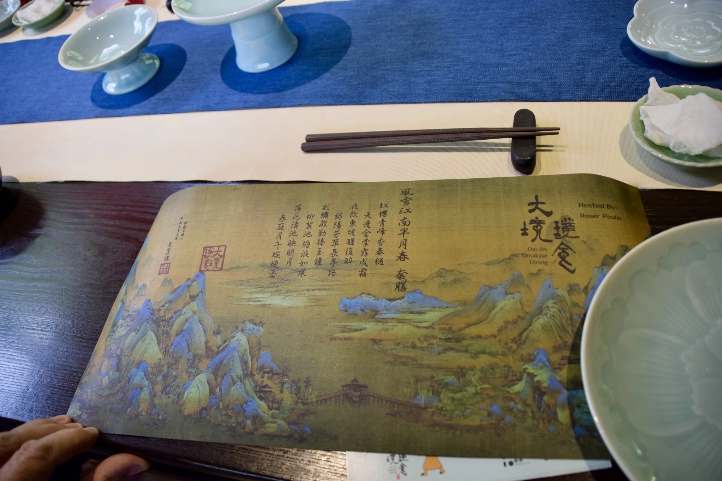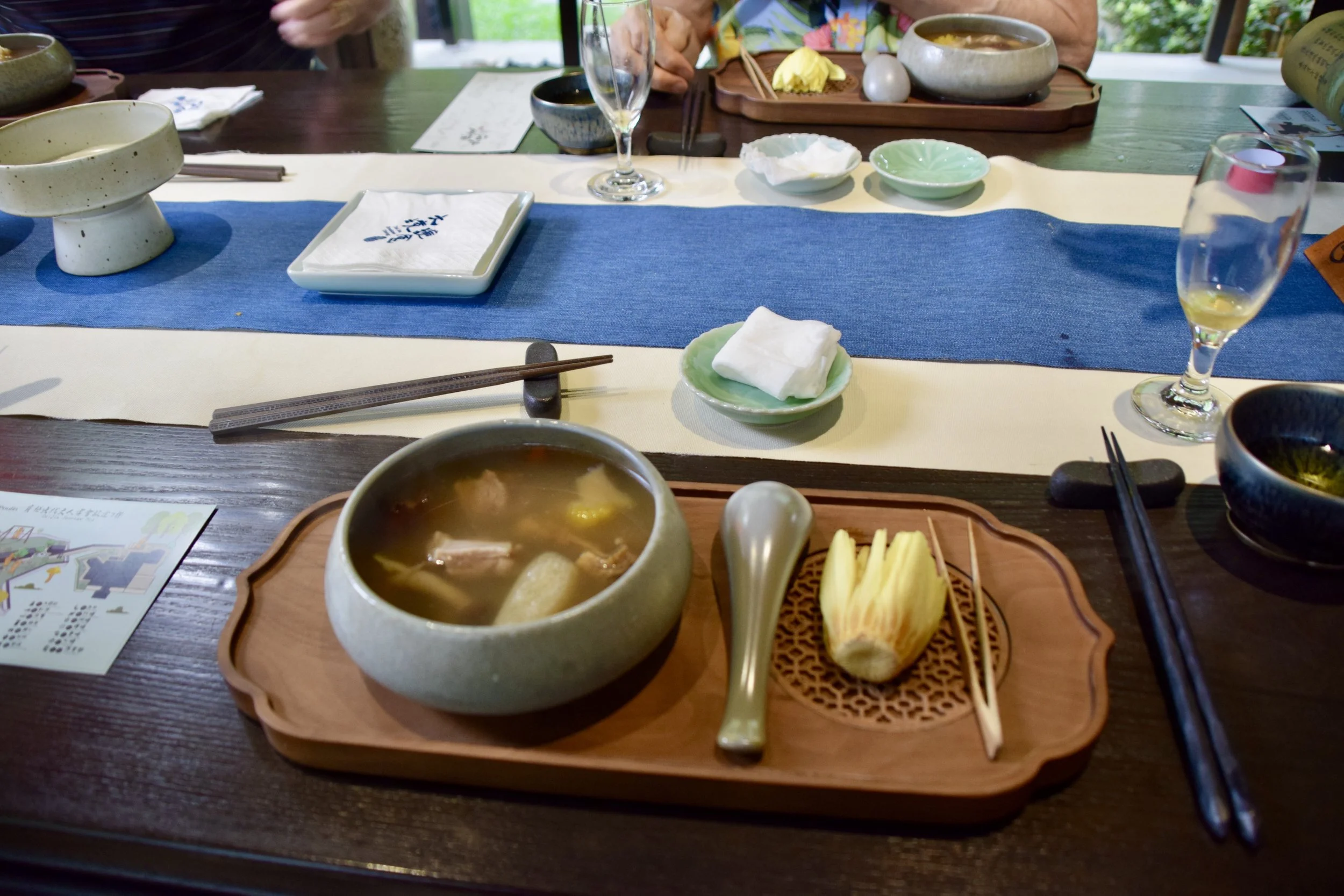 We were each handed a postcard-sized map (!) of the restaurant grounds, and on it the map says, “this experience brought to you by Roger Poulsin” (our friend who made the reservation). That was our first clue that this wasn’t going to be normal. The host led us through the gardens and pointed out each station. The first three involved shoes: a place to remove and store your shoes, then a small, shallow stream-like fountain to wade through to wash your feet, then a third station with dozens of wooden sandals you could then put on. We opted not to do the wading part.