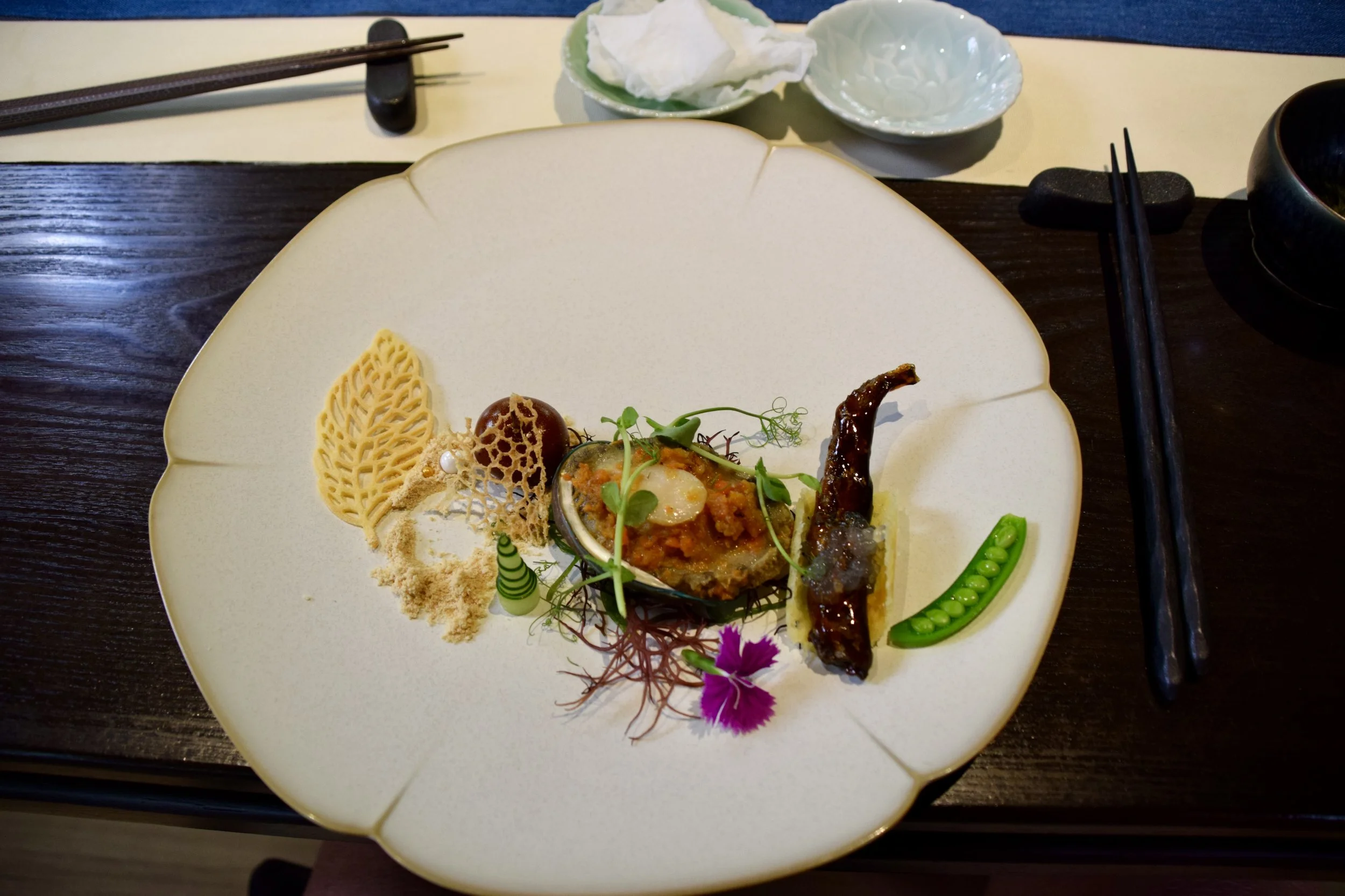 From left to right on that plate: leaf-shaped parmesan tuille, a “cherry foie gras” - which is a cherry…. um…. thing. You remove the stem and then the thing that looks like a fresh cherry ends up being a foie gras-like thing that melts in the mouth. Then there’s an abalone covered in crab roe, a glazed shishamo fish, and a tiny little pod with peas. I like the abalone best.