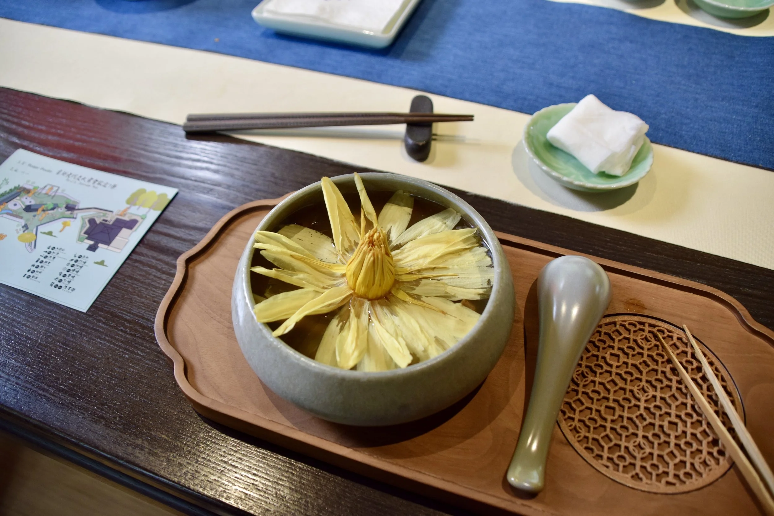 In the cups: hot oolong tea. The bowl at the bottom of the pic is “ten treasures”, apparently ten kinds of shredded veggies. It reminded me of the veggies you get in a mushu. The other bowl is sliced white radish marinated in tamarind tea and I had no idea that was even a thing, but it’s something I needed in my life, and didn’t know it until now.