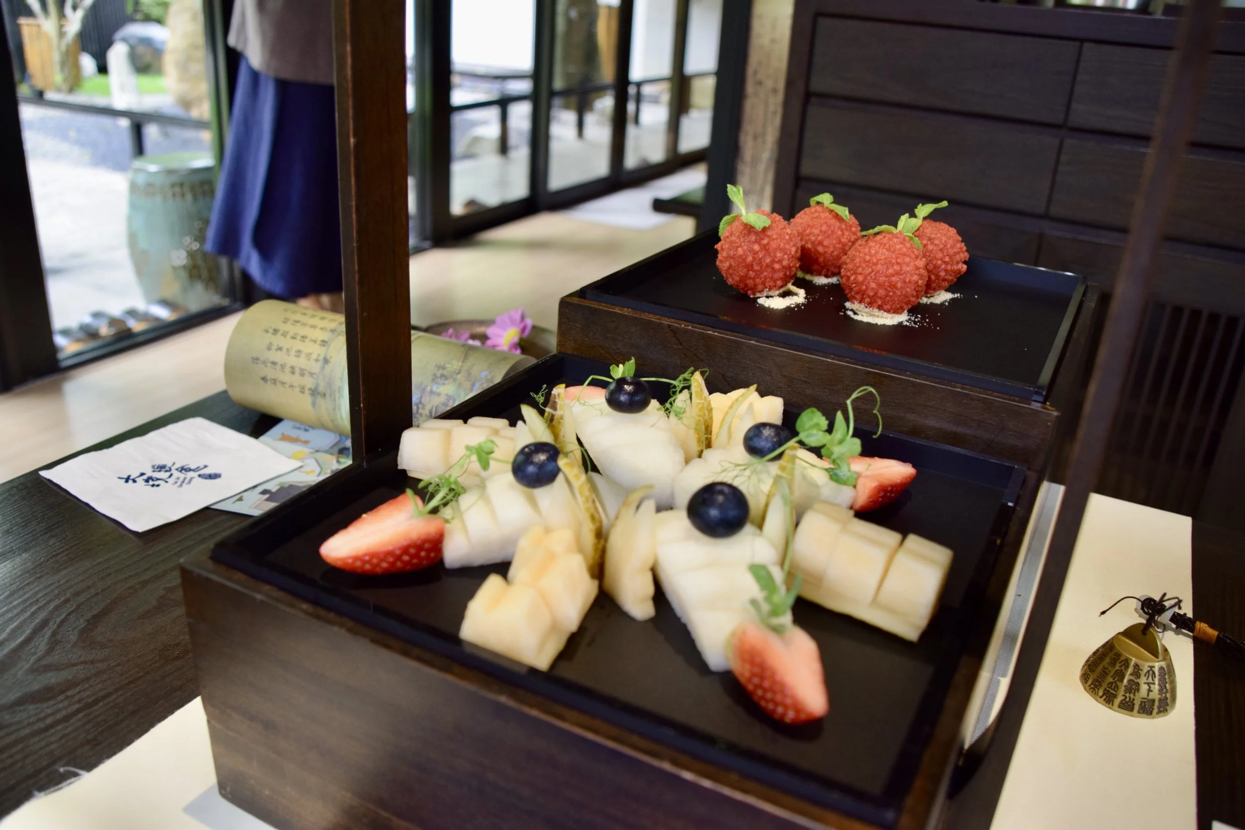Those are prawn dumplings made to look like koi fish. They were delicious and the two dipping sauces were really good, too. One of them was a bit like teriyaki and the other was legit spicy. We were all getting stuffed by this point, but we weren’t done yet. The waiter returned with a beautiful wooden treasure box, which opened in sections.