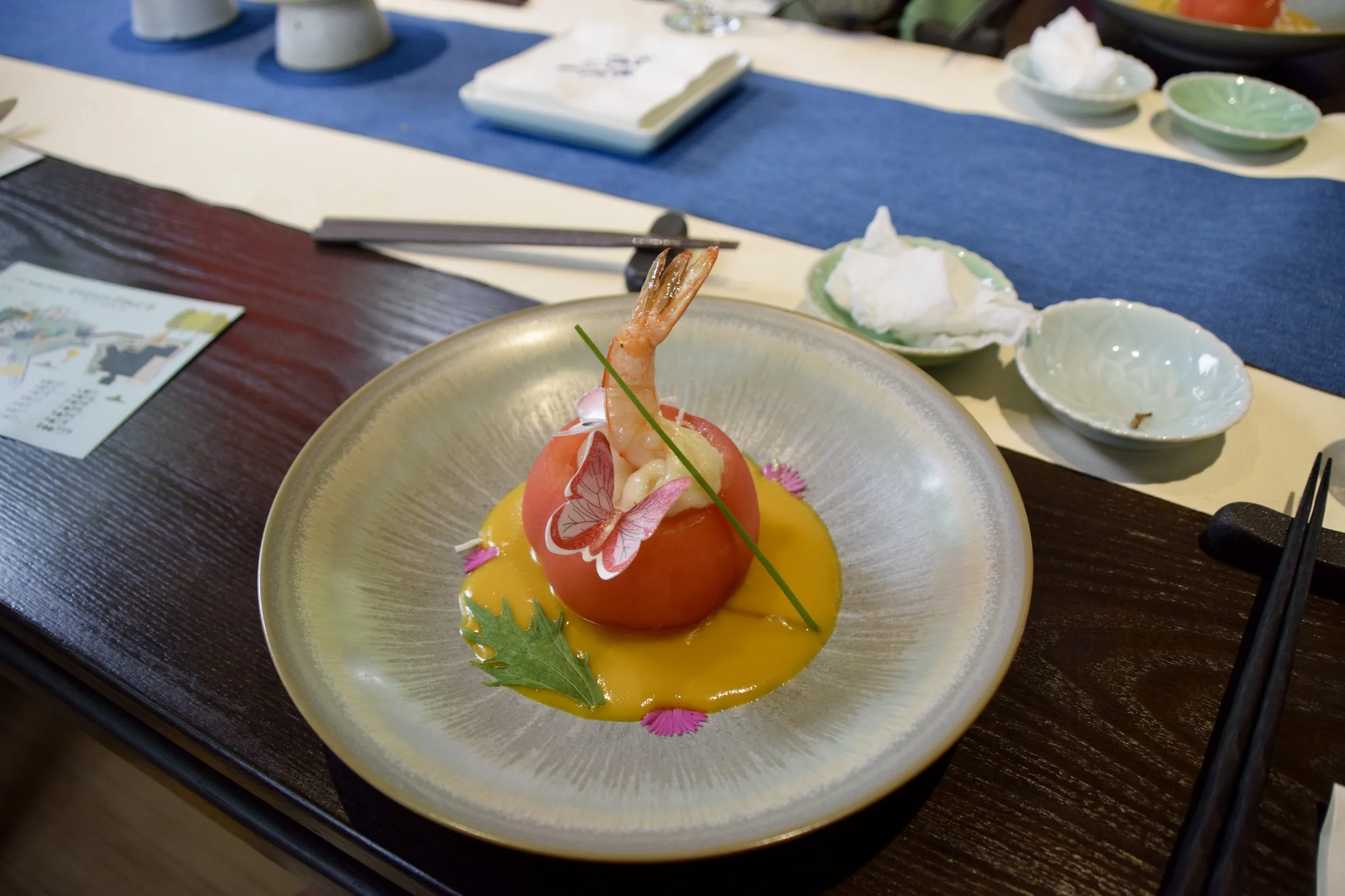 This is “Crimson in the Sea” - it’s a large prawn in a tomato filled with some kind of egg custard sitting on a sweet-ish sauce. The butterflies were made of rice paper and edible as well. And yes, I know that I’ve eaten some “interesting” things on this trip already, but people who’ve known me for awhile will be absolutely shocked to hear that I ate a whole tomato. (shudder)