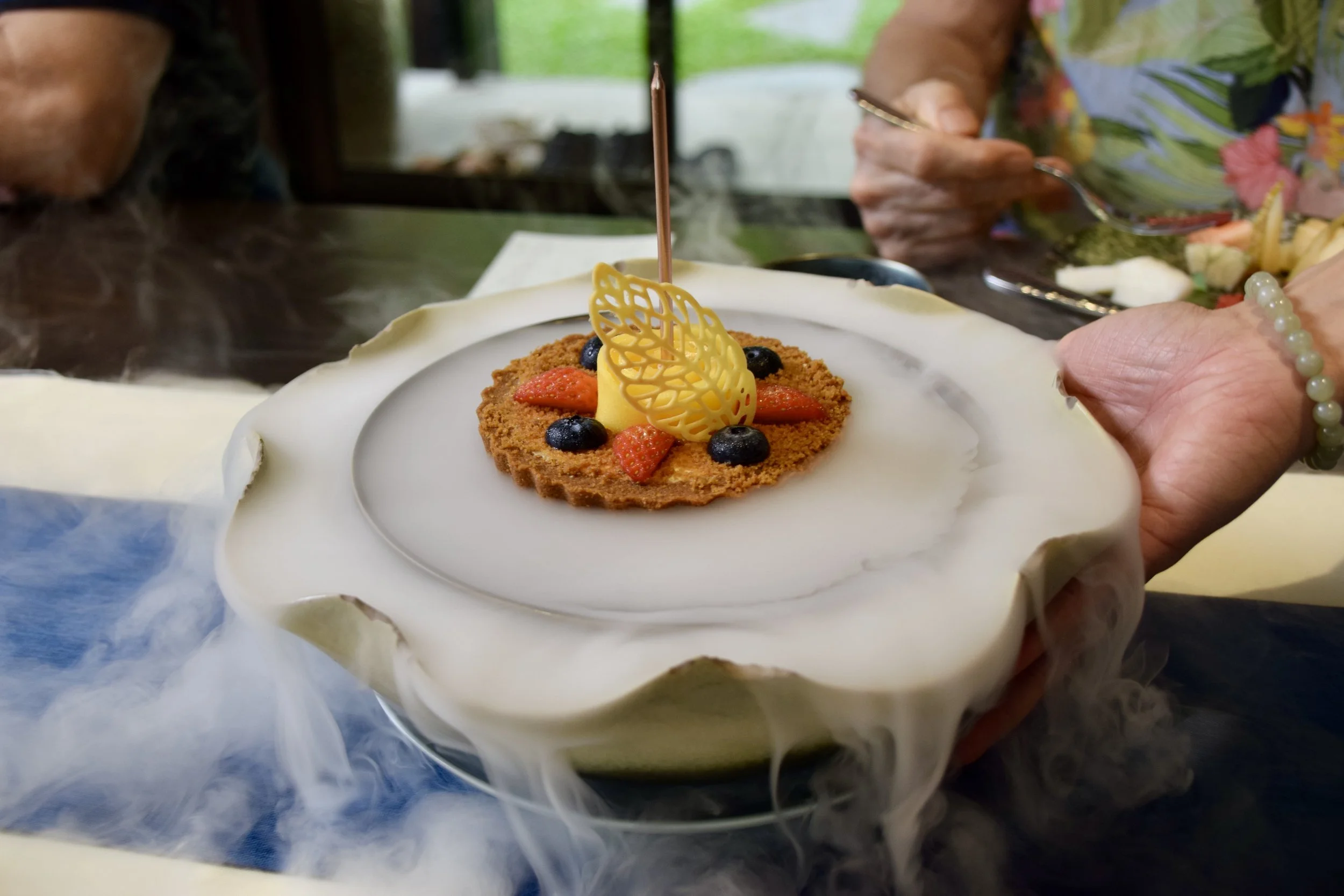 The bottom tray is a selection of fruit - strawberries, blueberries, pear, honeydew melon. The top tray are little balls of fried dough filled with a raspberry coulis. Oh, but wait… we’re still not done. They brought us a nice little gift bag. The treasure box had samples of the oolong tea we’d been having with dinner. They also brought us a 5x7 wooden photo frame with a copy of the photo of us on the swing. Nice! Then they rolled up with yet another dish with dry ice fog emanating from it, holding a banana cream cake with a graham cracker crust. It would have been even tastier if we weren’t already stuffed, but we were happy to eat it anyway.