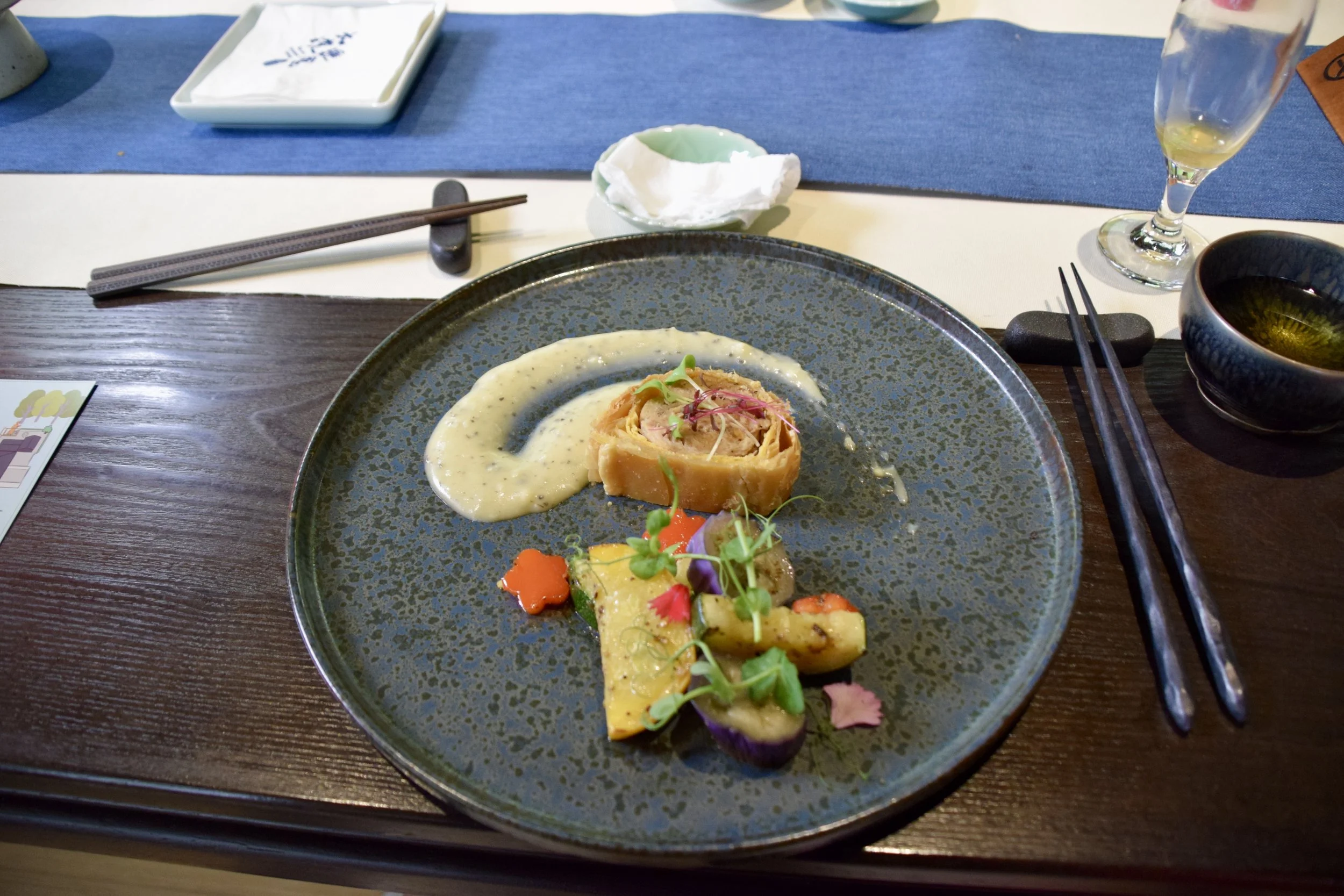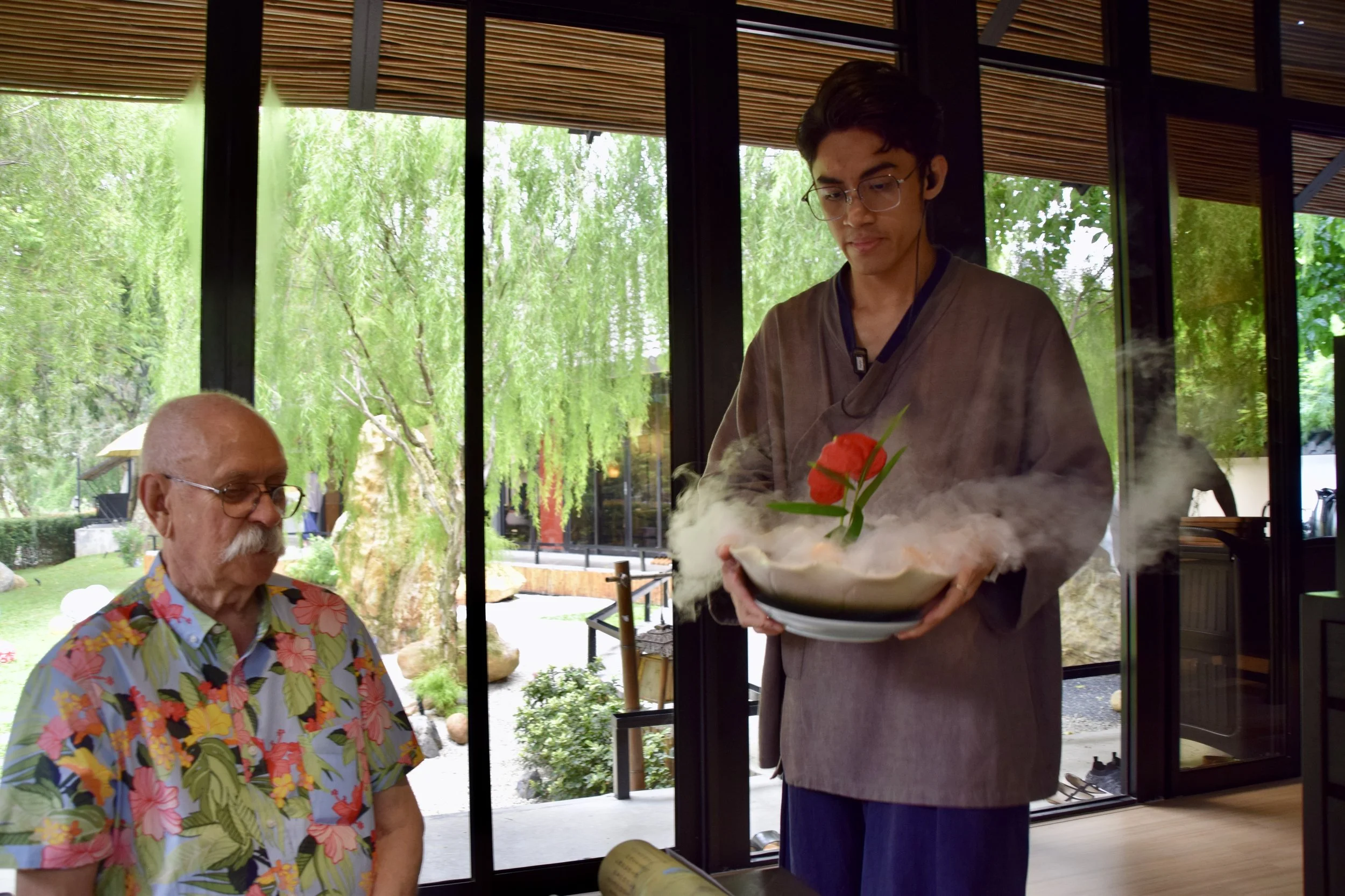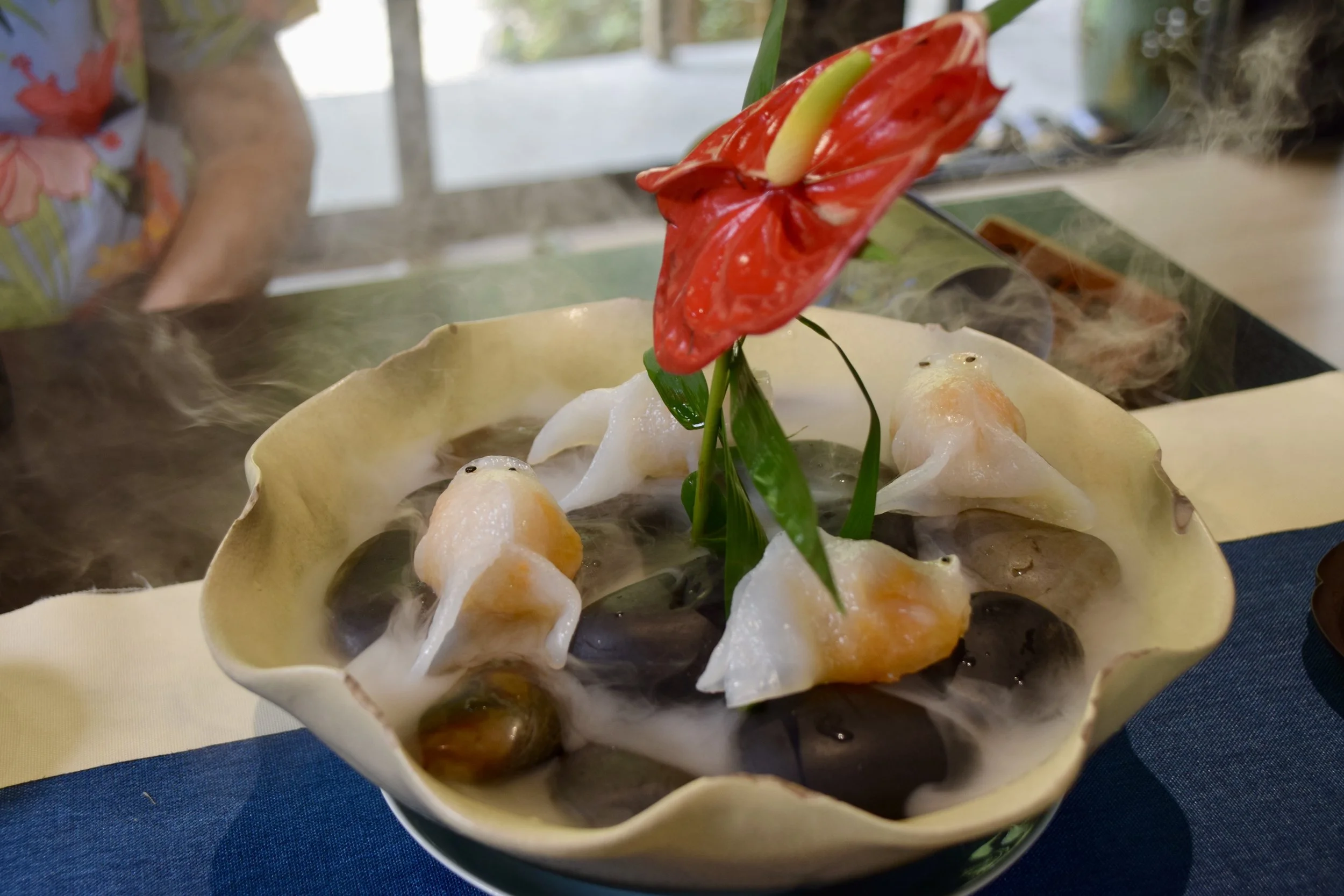 My favourite course followed. Not just because of the dramatic dry-ice fog presentation, but because the food was delicious and it had a spicy sauce for dipping.