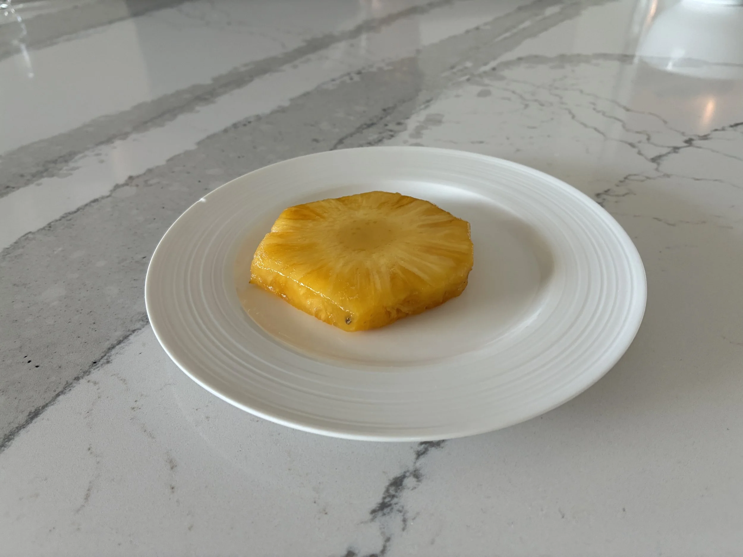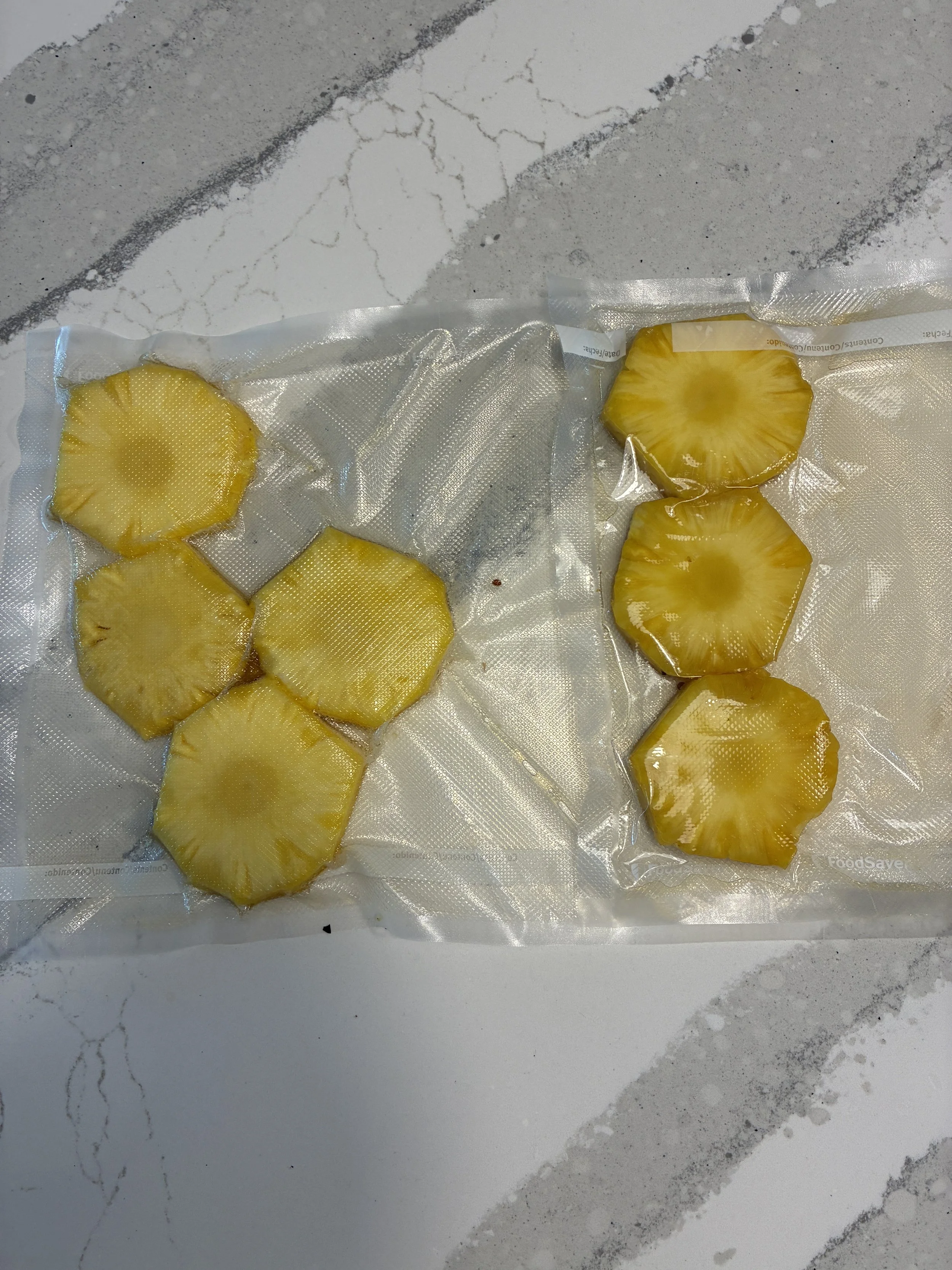 Jon came home from work late afternoon and broke open the seal on the compressed fruits we experimented with yesterday. The watermelon was pretty much the same as I had in that weird dish at Catch 122 a few days ago, but the star of the show were the pineapple slices marinated in spiced rum, then compressed. Wow, they were good.