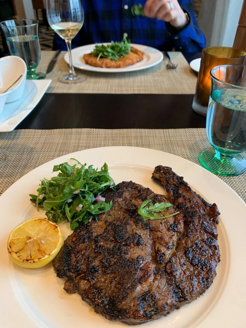 Anyway, the six of us had a grand time while we waited for the main course… Rob had a veal thing that looked like schnitzel and I had a rib eye steak rubbed with mushroom powder, brown sugar, and chilli flakes. Holy crap, was it ever good. It legit gave Longview a run for its money. (For those unaware, Longview Steakhouse in Longview, Alberta, Canada is about 90 minutes’ drive from our home in Calgary and it’s listed as one of the 15 best steakhouses on earth.)