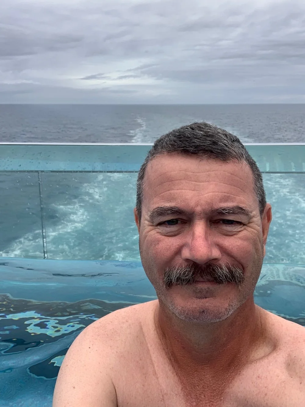 Because the ship was moving, I knew that the infinity pool would be heated, so I headed back there. The nice thing about being 55 yrs old and the youngest passenger on board is that I often have the pools to myself. Today was no exception.