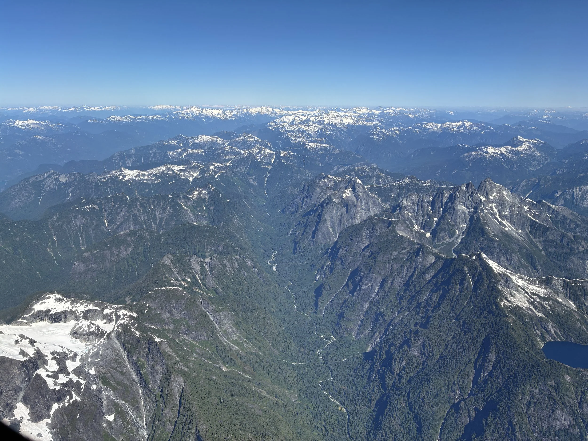 Before long, we were on the plane and over the Canadian Rockies. Very little snow left, but there are the occasional smallish glaciers hanging on to a few peaks.