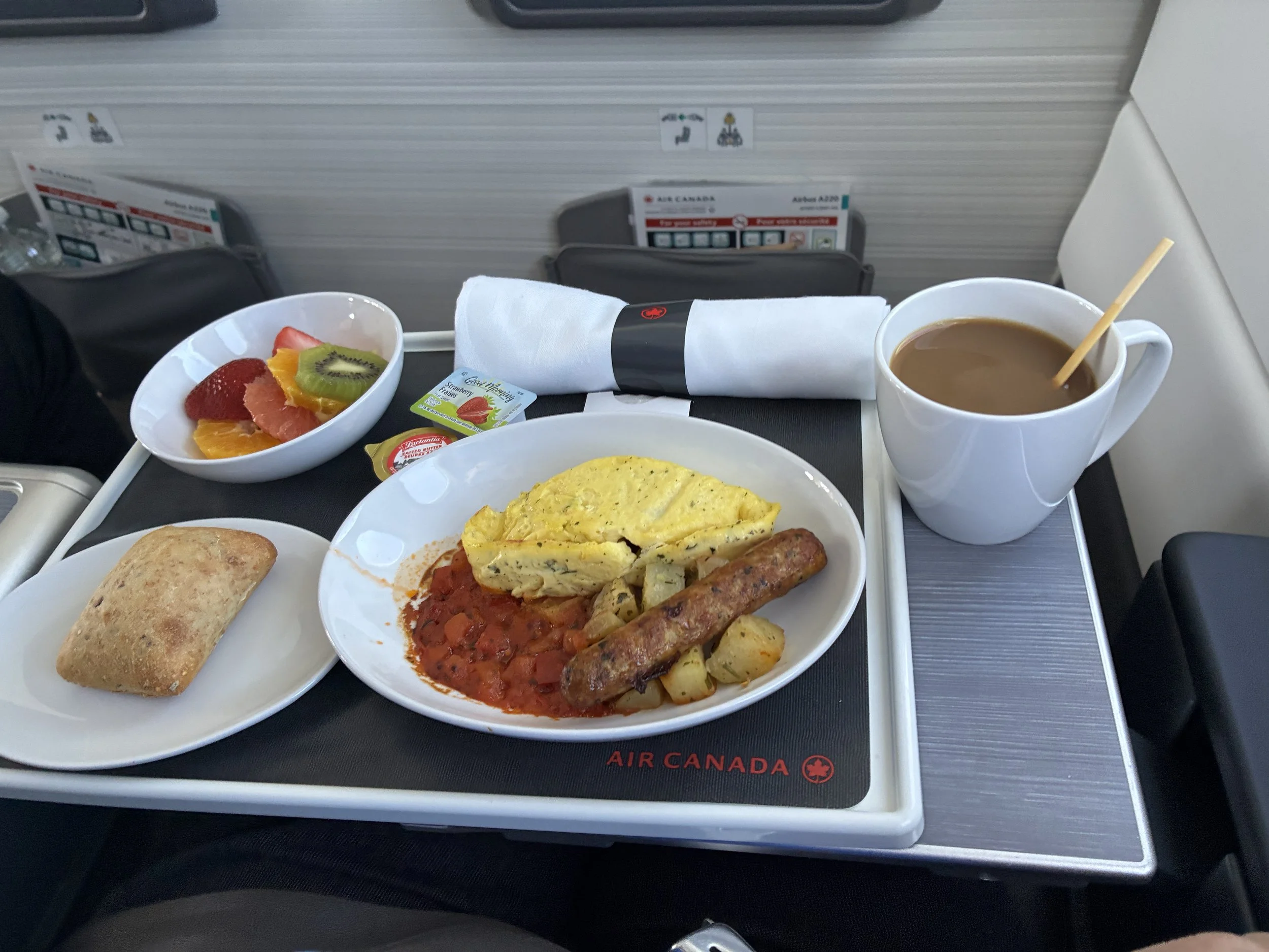Air Canada can be hit and miss in terms of the food and service, but this morning we had some really nice eggs with a chunky ranchero sauce, potatoes, fruit bowl, and a sausage. Really good - and here’s your first food pic.