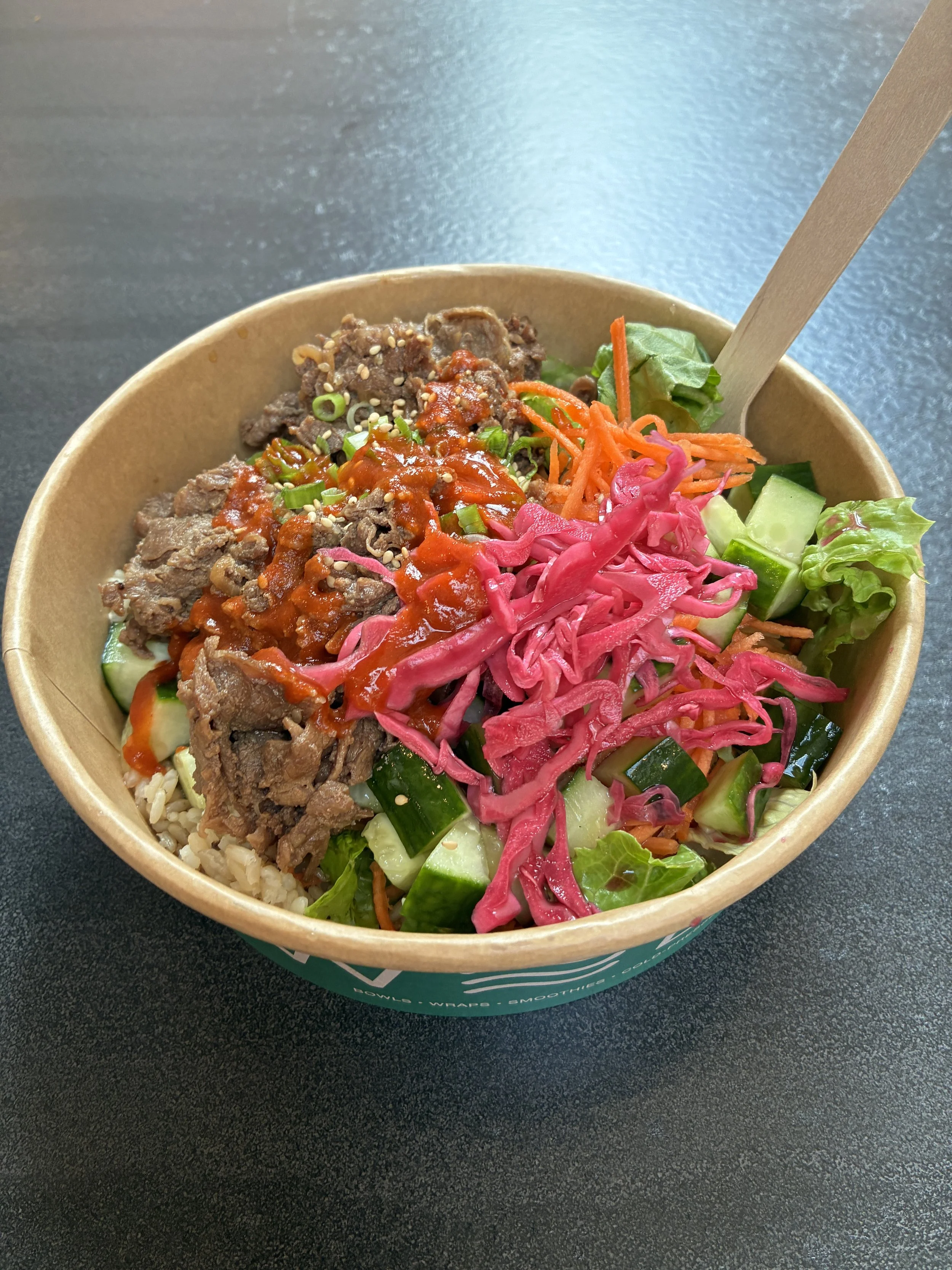 Decided on “WELA” for lunch after seeing a group of people with food from there that looked really good. It was! Got the bulgogi bowl (Korean style marinated sliced beef, carrots, cucumber, pickled red cabbage, brown rice, sesame seeds, onions, romaine lettuce, and a big dash of sriracha sauce.)