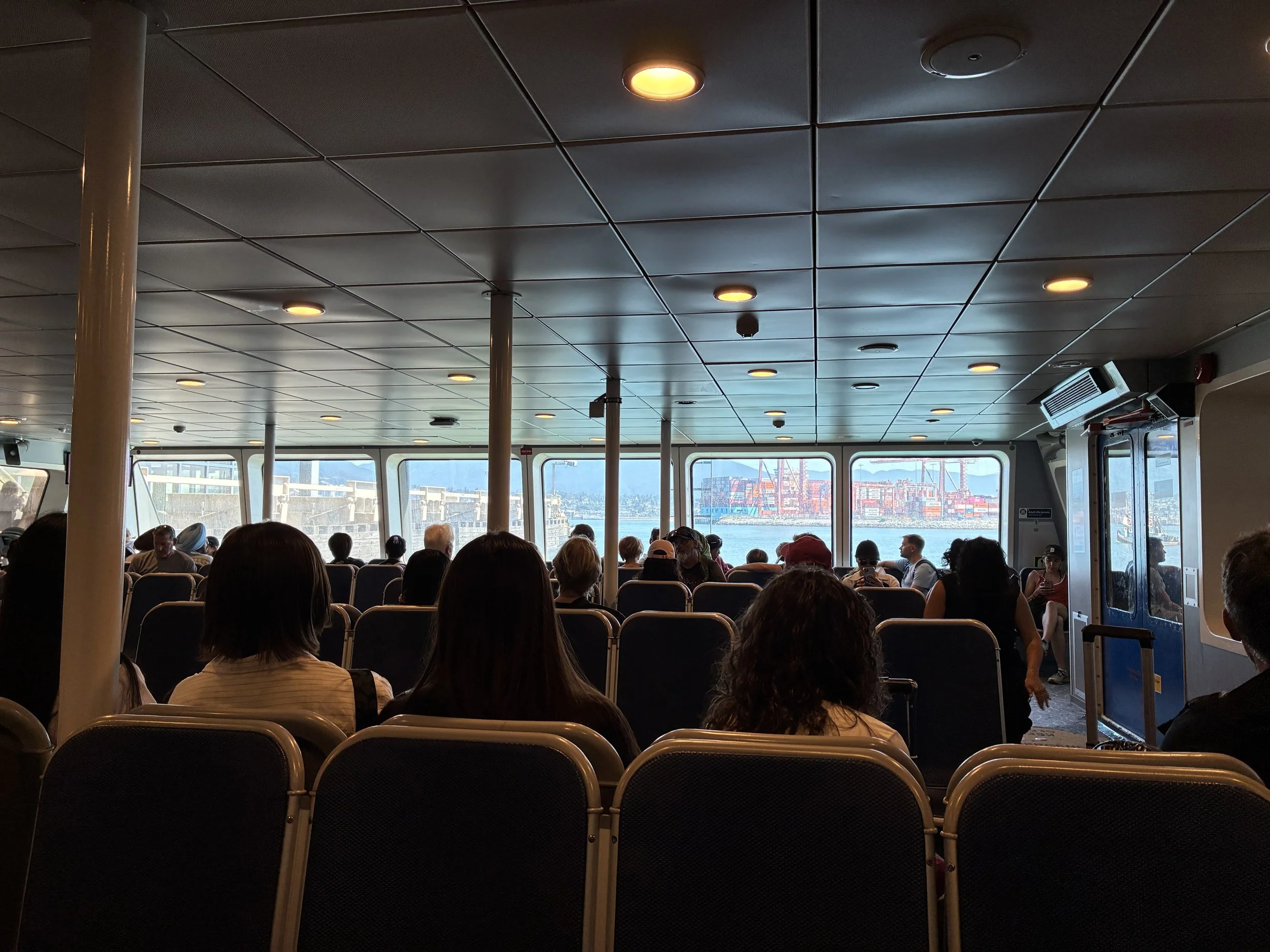 We rode all the way to the end of the line and got off at the Waterfront station, where we transferred to a SeaBus. These are rectangular, squatty boats that cross the harbour all day from Vancouver cruise terminal area to North Vancouver. The boats are roomy and the trip is only 12 minutes.