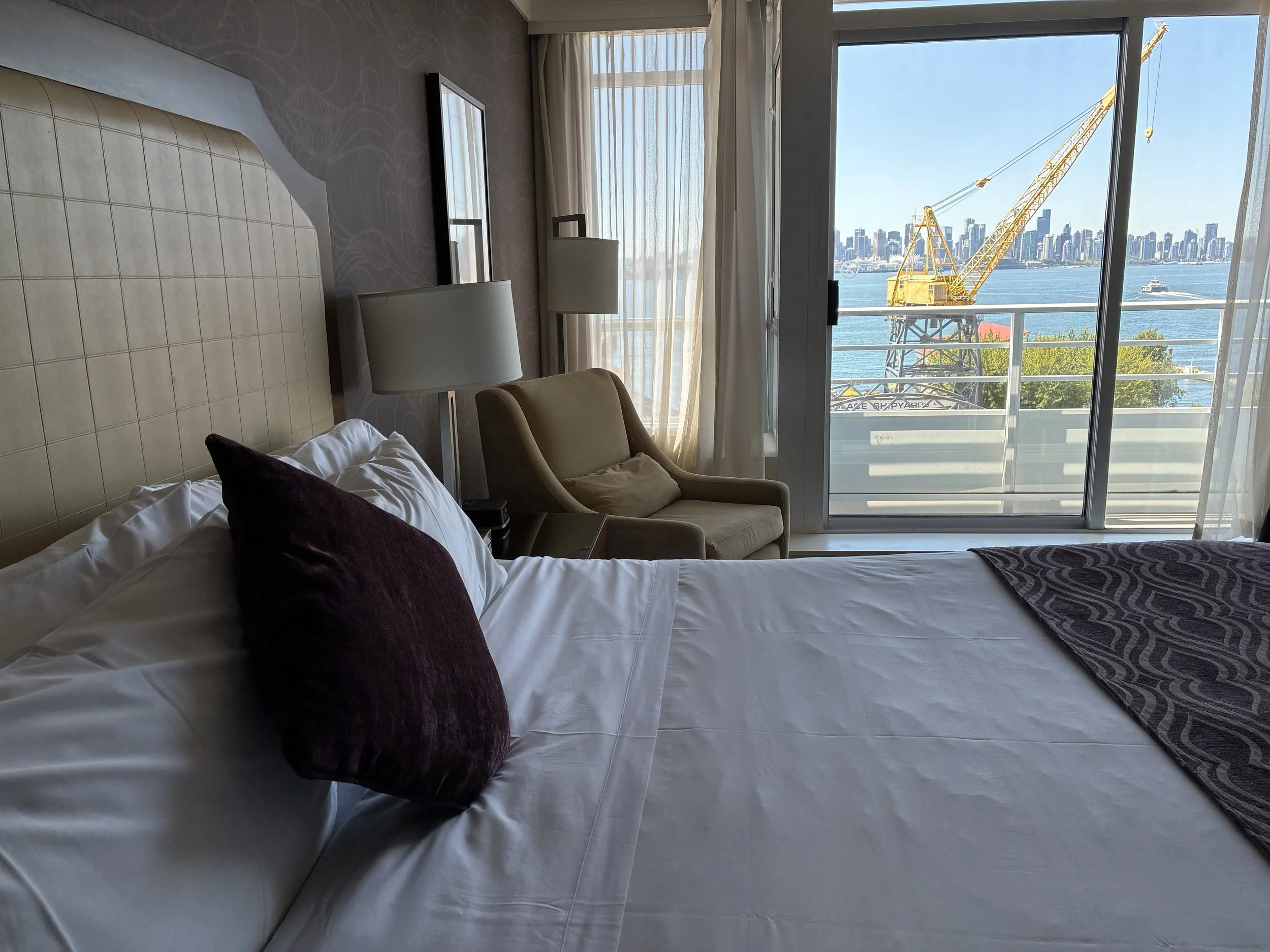 We walked a short distance on a gorgeous sunny day to the Pinnacle at the Pier, one of Rob’s favourite hotels. We were well before check-in time, so our room wasn’t available yet, but the nice lady at the desk offered to put us in a different room that was ready to go. Sure, no problem! When we got to the room, we realized we’d been upgraded to one facing the harbour. Suh-weet!