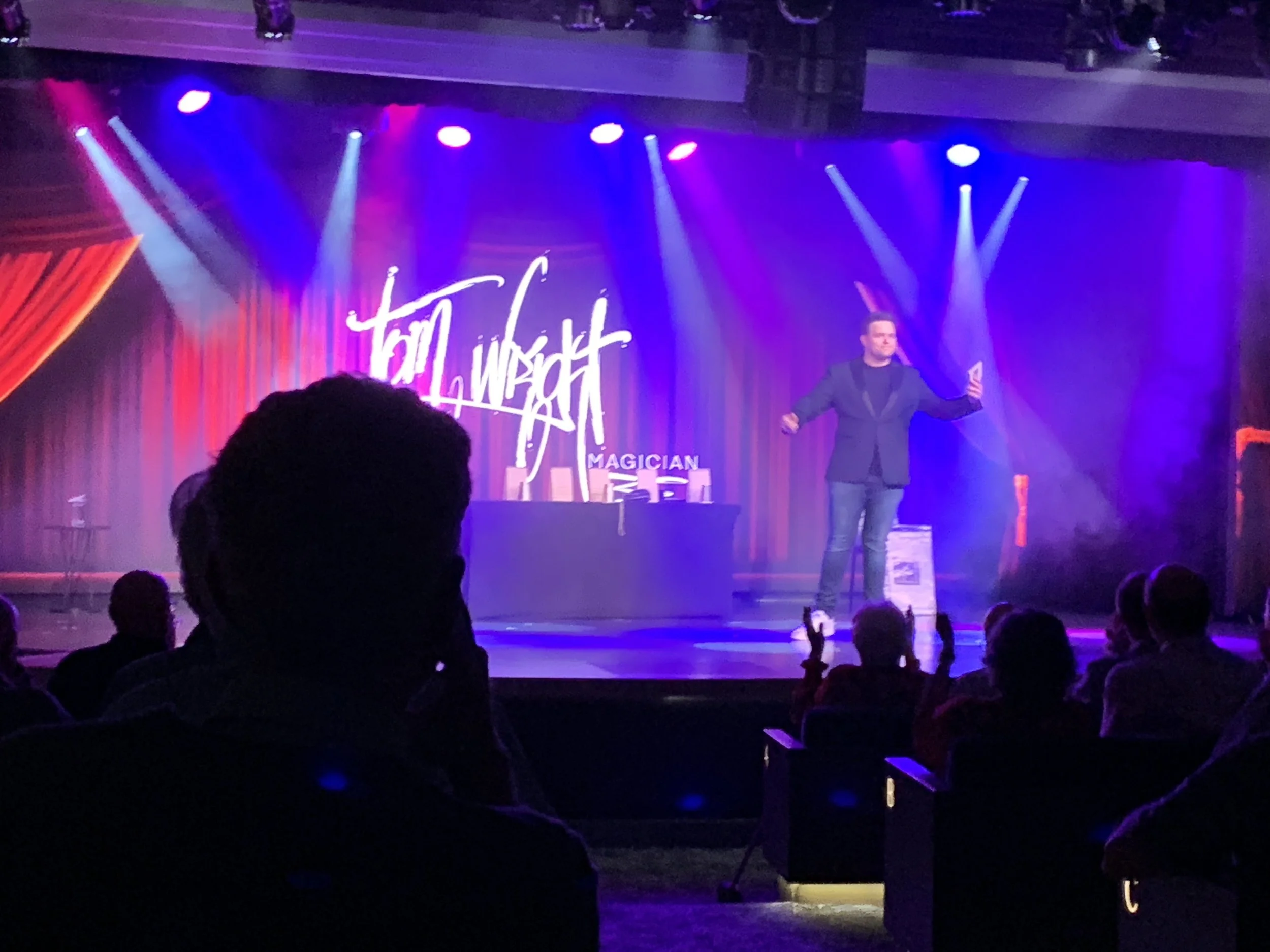 OK, back to the ship. The entertainment for the night was Tom Wright, a comedy magician. “Comedy magician” means it can either be wildly entertaining or cringe-worthy. He was fine, but I’d seen other magicians do a lot of the tricks he did. They were still impressive, though. I mean, I knew right from the start of the trick that the $20 that Julie from the audience had written her name on would eventually show up inside of an orange that he had to cut into, but I still have no idea how he did it.