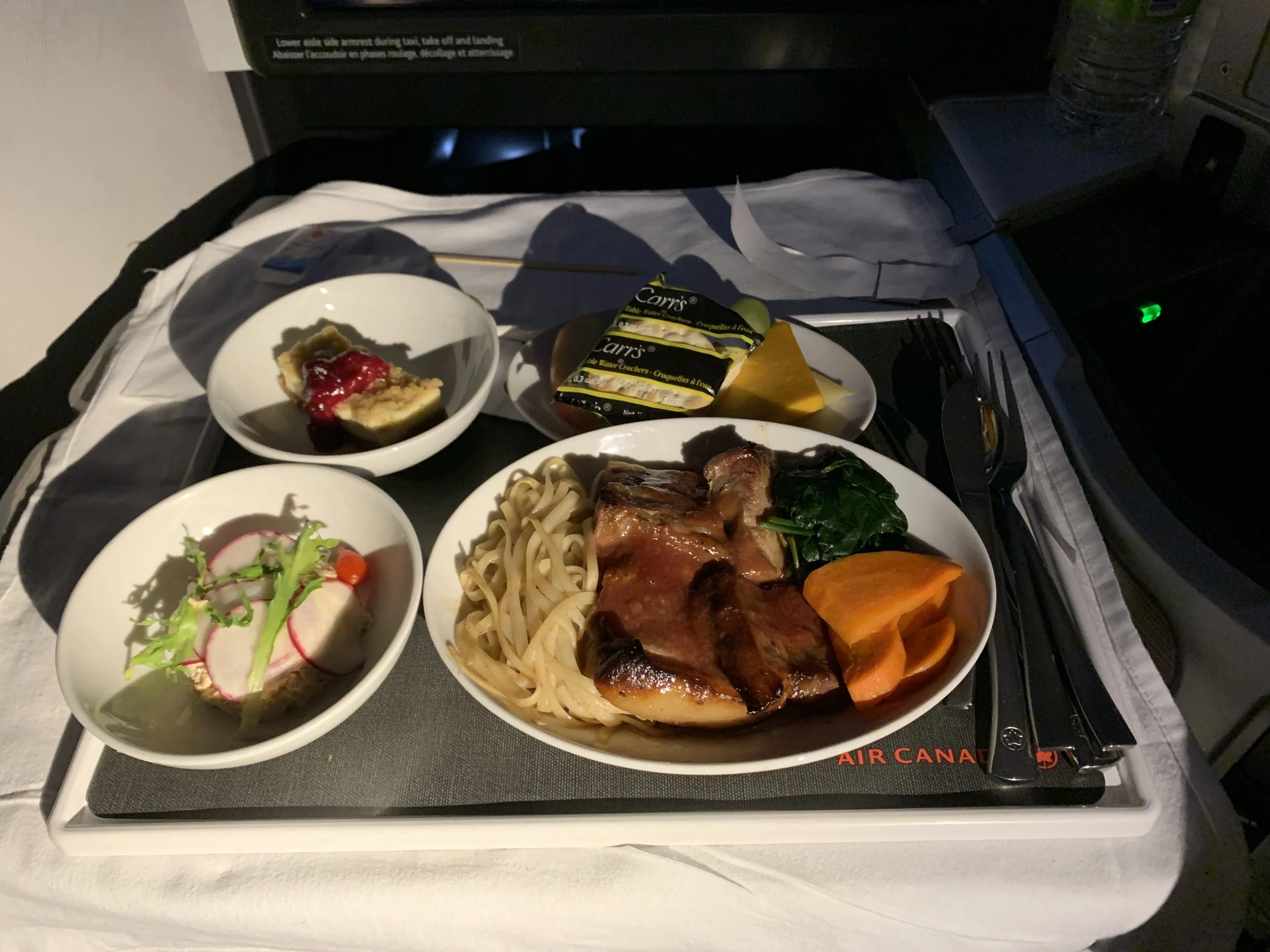 Air Canada uses a Boeing 787 Dreamliner with lie-down pods in business class. The seats are adjustable in a bunch of ways, but the main thing is they lie down flat if you want to sleep on your side. I did that a couple of times, but mostly I did a position similar to a La-Z-Boy recliner and that’s always been one of my favourite positions to sleep in.