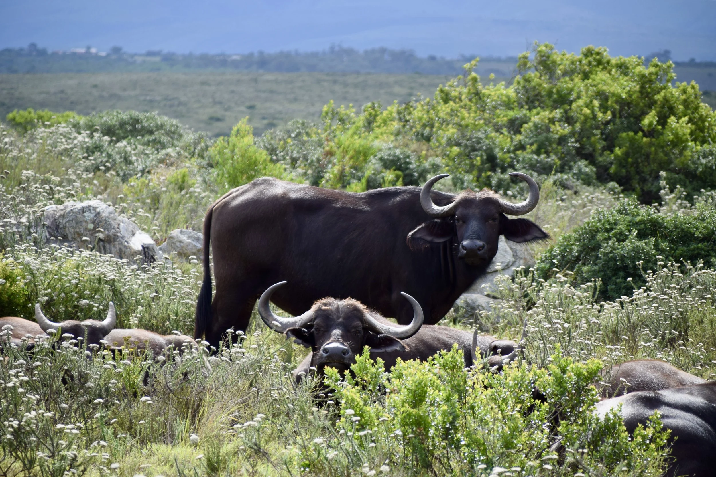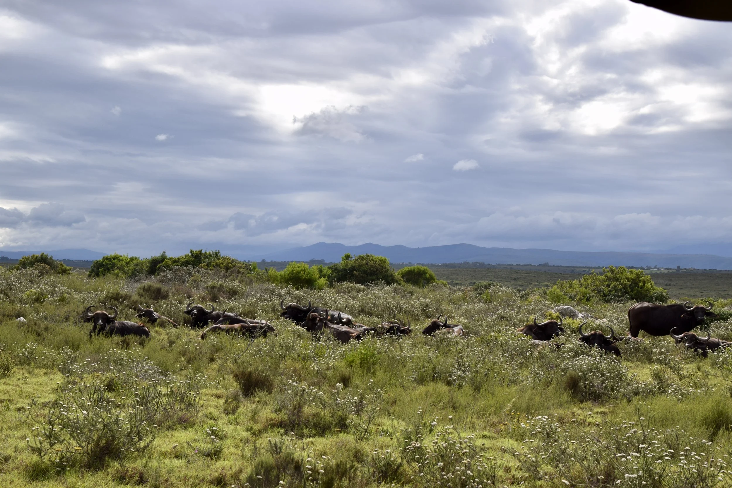 Before long, we came across a herd of Cape buffalo. We saw buffalo a few days ago, having a bath in a pond, but there were a lot of buffalo out here on top of this hill. There were a couple of babies, too.