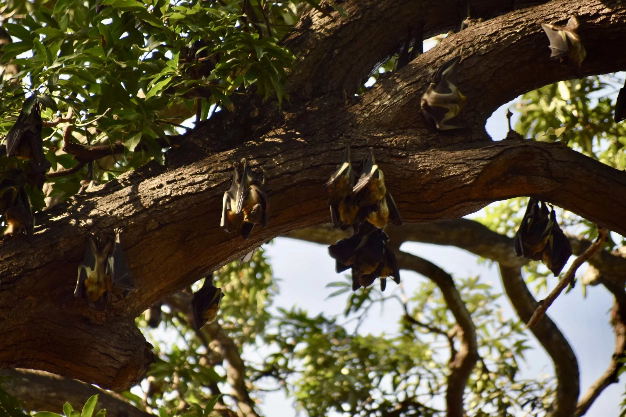 The trees are absolutely jammed with fruit bats. Hundreds and hundreds of them. Most were asleep, but a few would occasionally fly around.