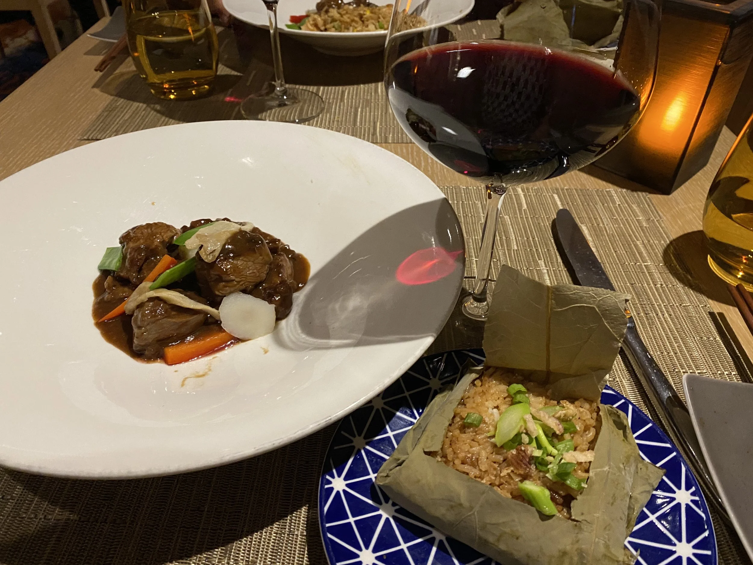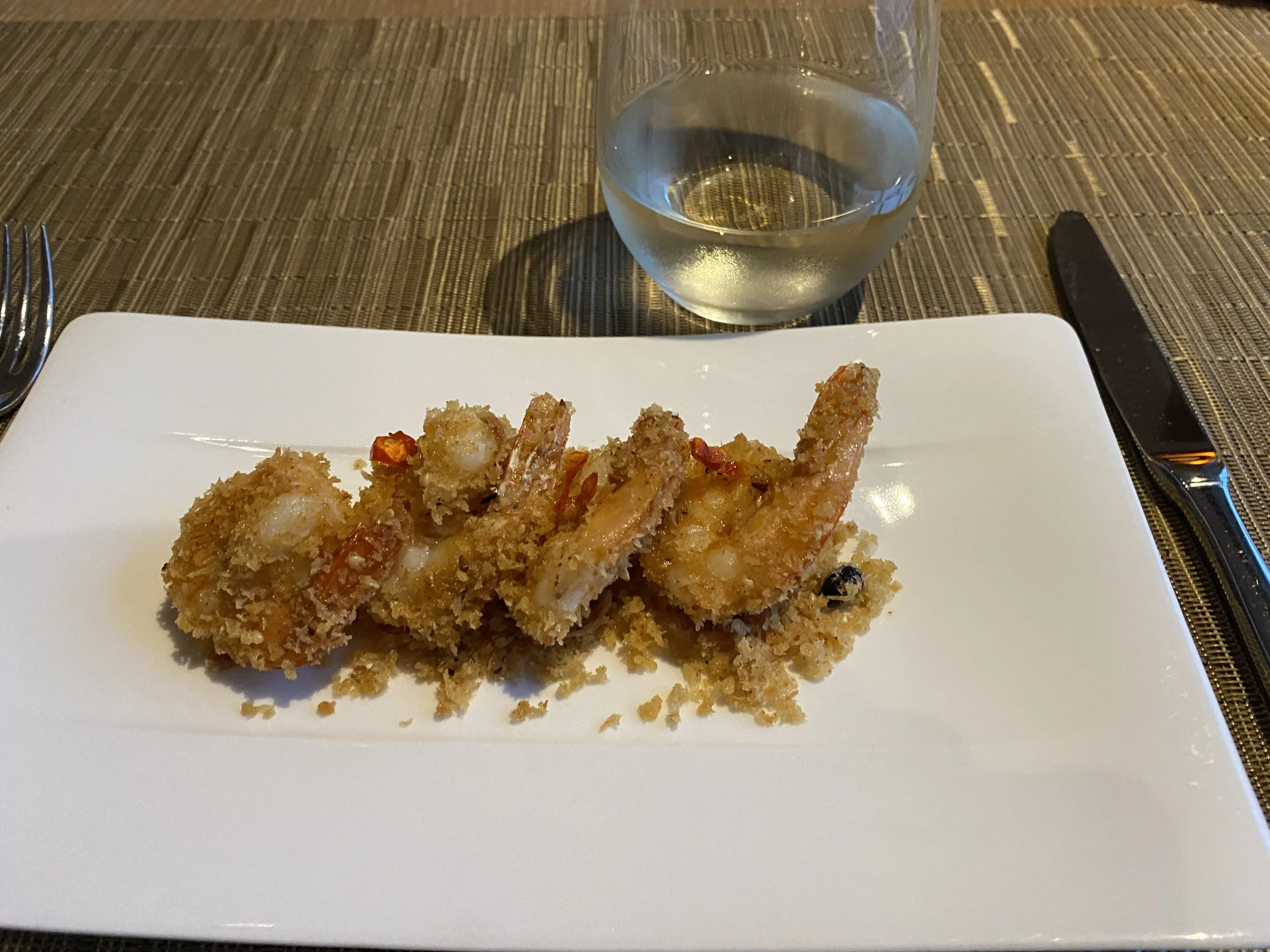 Up to the Explorer’s Lounge for a quick martini then off to Chef’s Table for a new menu: Xiang (which the server pronounced “Zhy-ong” and I’ll take his word for it. It opened with a hot and sour soup with calamari and shrimp (delish) and then went to a grilled, panko’d prawn dish that was slightly spicy in all the right ways. It was paired with a Pinot Grigio, which complimented it perfectly.