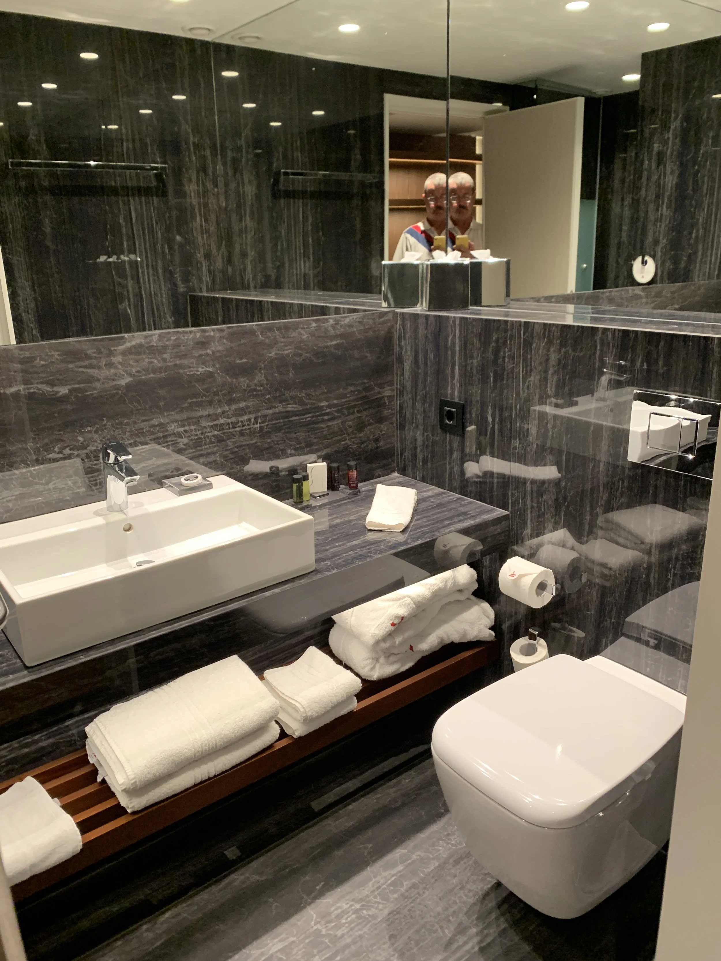 It’s clean and comfy… except for the toilet, which has a square seat. Odd.