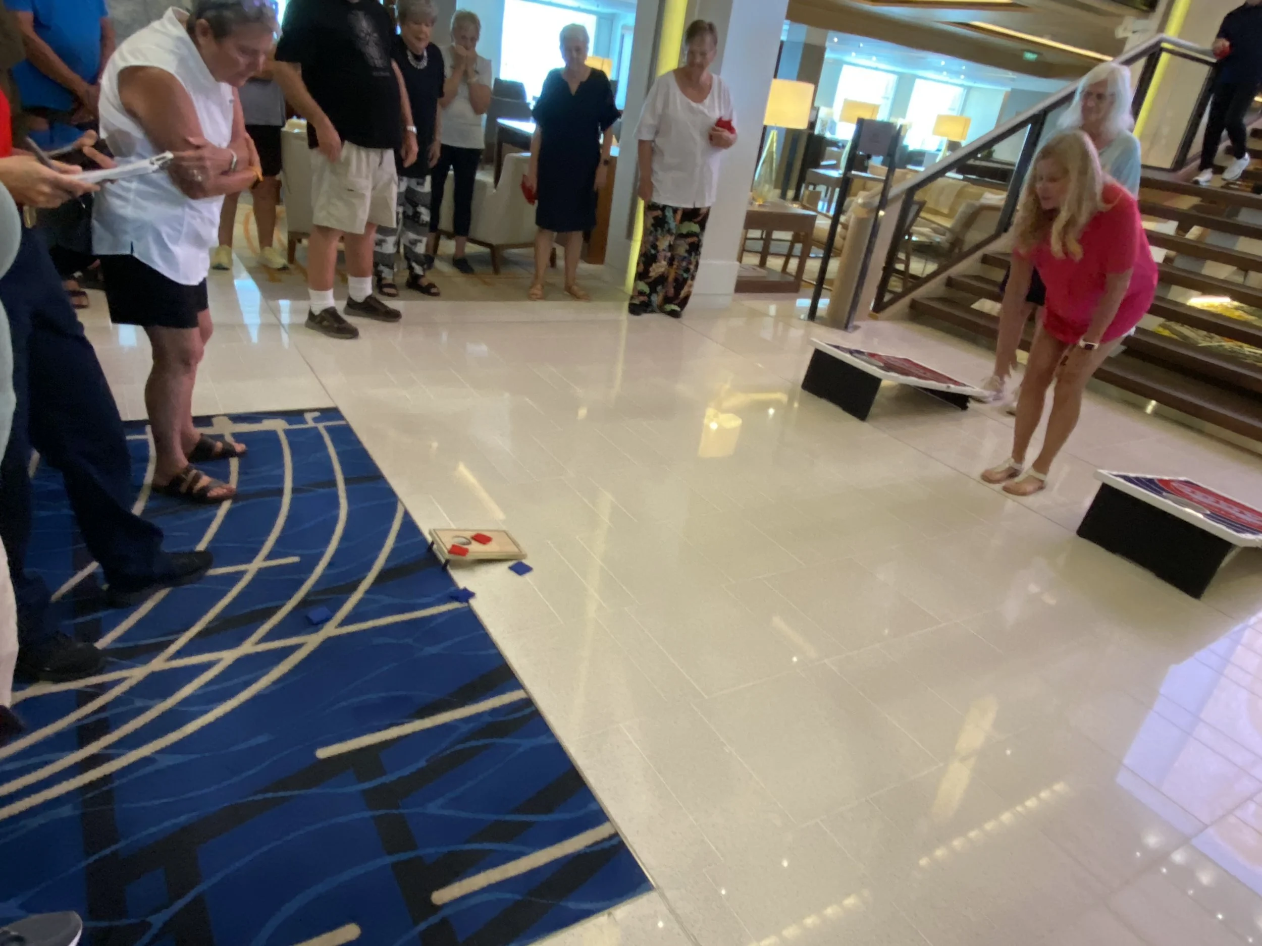 Lazy day today. Brekkie, then baggo. I did OK, but the team lost by 1200 points. There are one or two people on the team that take it way too seriously, everyone else just has fun. Win or lose, doesn’t matter. Interesting twist today: there was a crew safety drill going on, so if a pair of throwers was up and an announcement came over the PA, those throwers got to also shoot three tiny bags at a tiny board. It was like throwing ravioli at a shot glass. On the board was 500 pts, in the hole was 1000. There were five episodes of this high-stakes round.