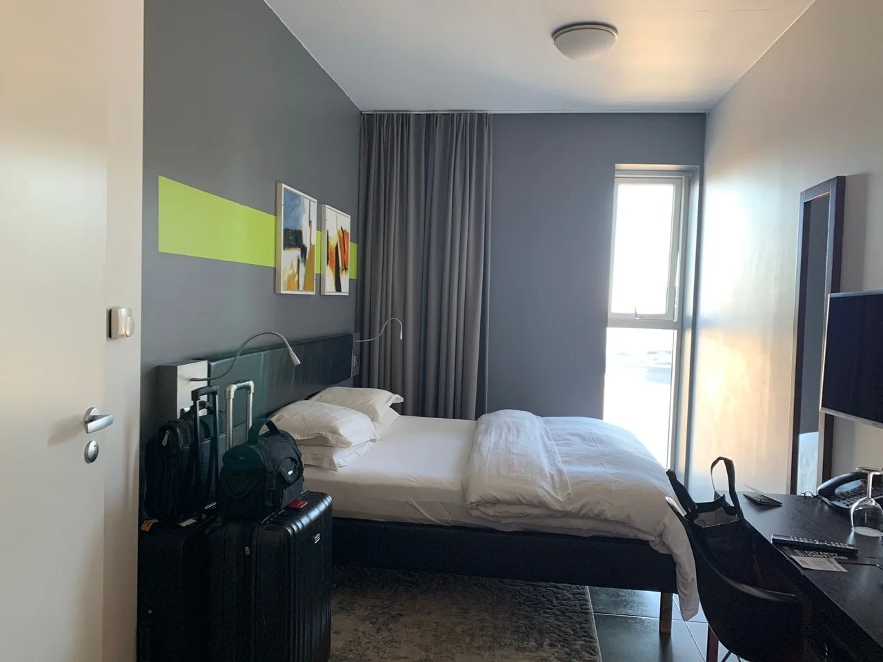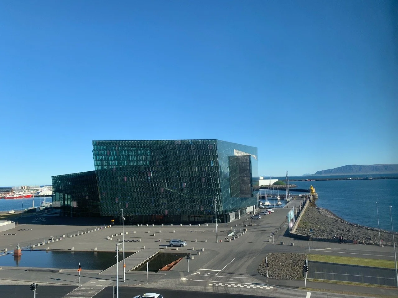 The view from our window overlooks the coast and Harpa, the performing arts centre.