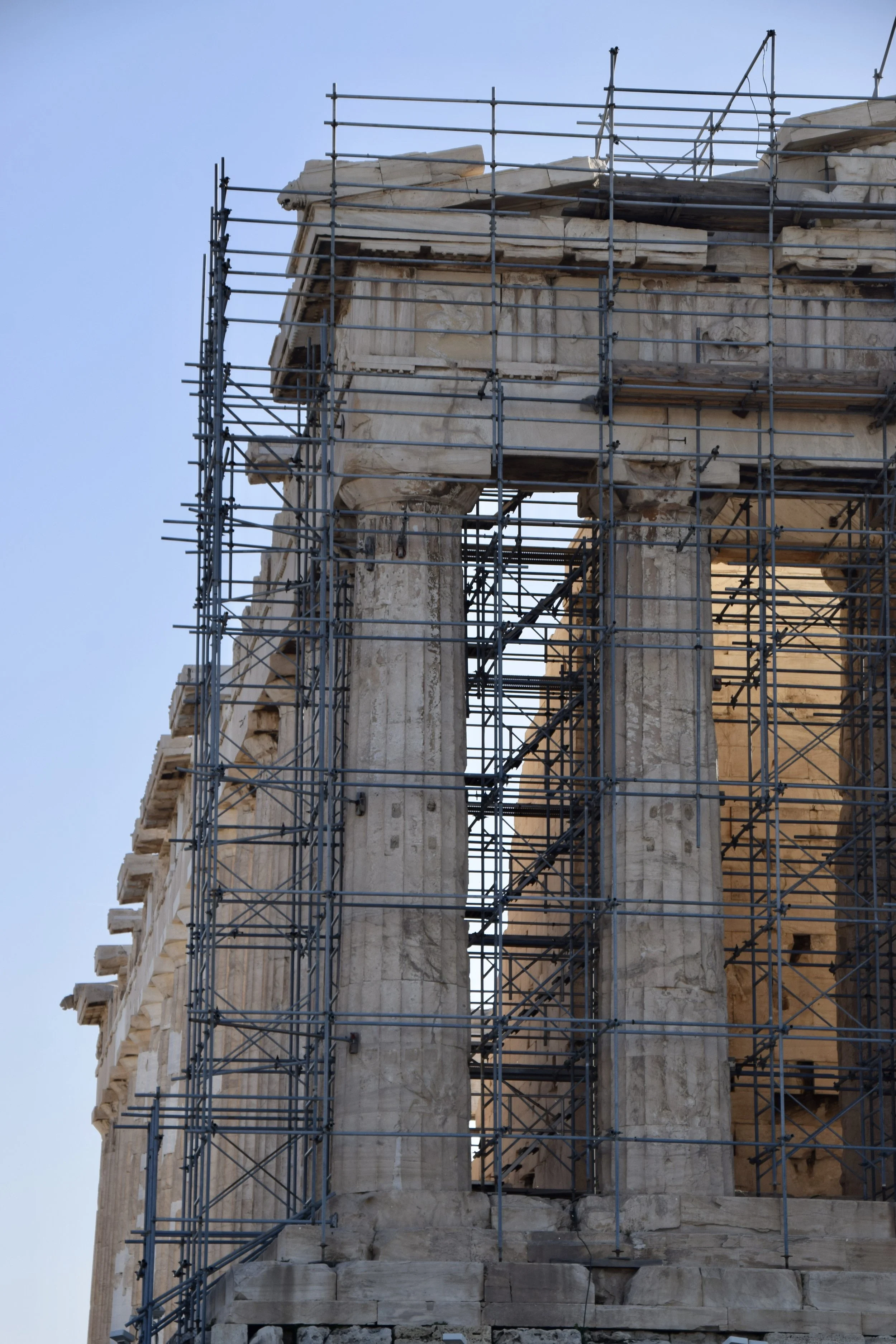 Yes, it’s massive. And the Greek architects at the time knew that the human eye will skew things at this scale. As the columns rise, the eye perceives distortion, even where none exists. To counter this, the columns lean in toward the centre ever-so-slightly and the ones on the corners lean on the diagonal. Thus, to the eye, they appear perfectly straight. It’s a neat trick - and one you’d swear was just a myth, except that they’ve got scaffolding around part of it, which IS vertical and you can see how the columns don’t follow that line.