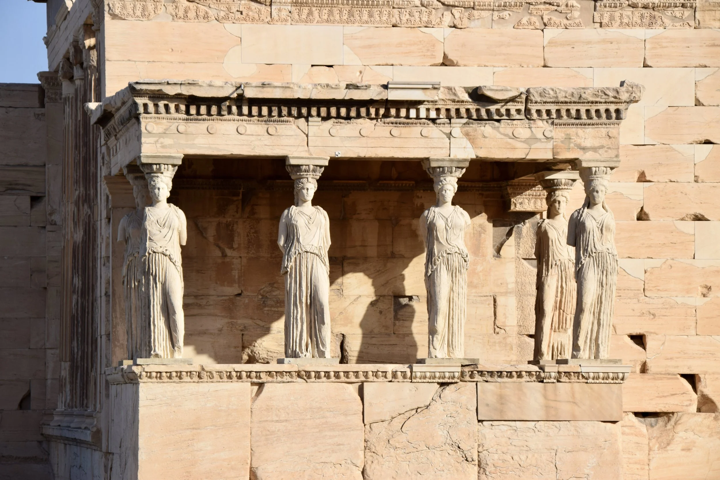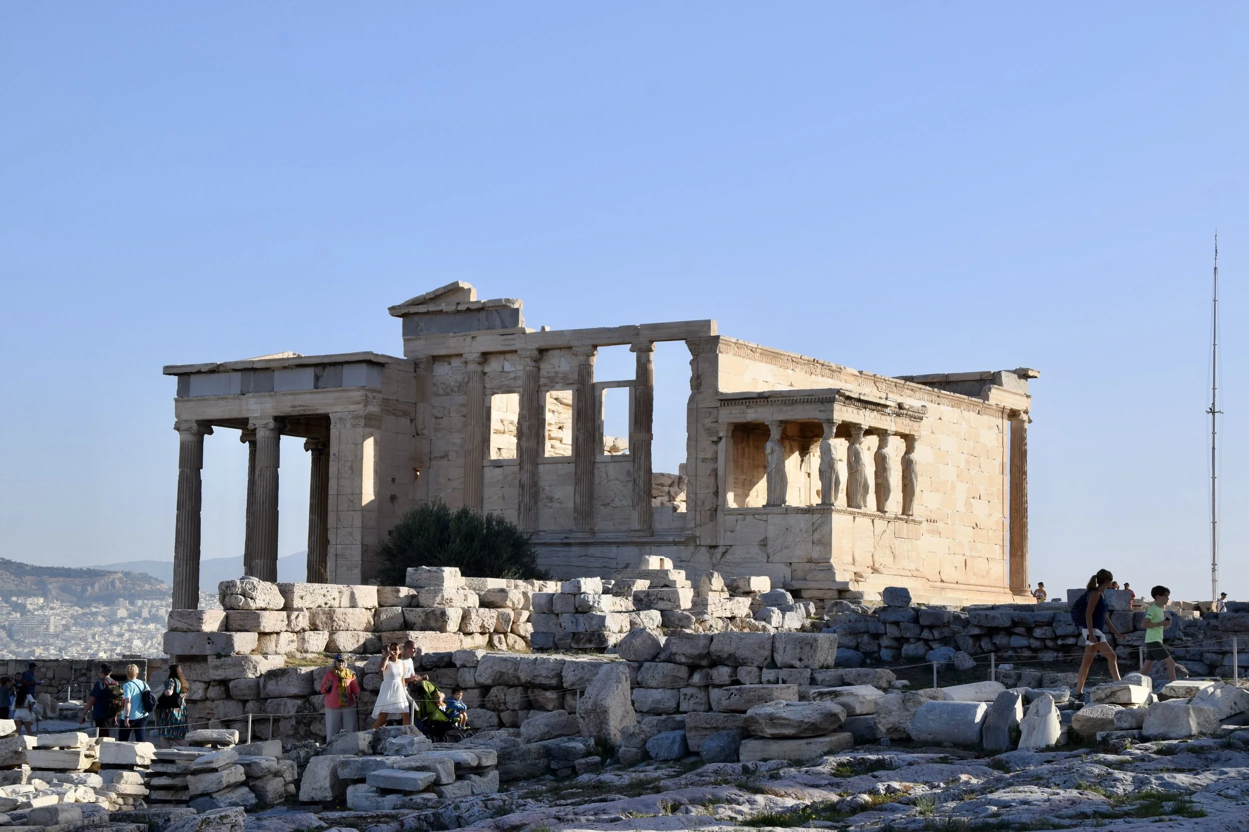 Notice in the picture above, the different shades of marble. The marble is local and it’s brilliantly white, but 2500 years of weathering and sun turns it that pinkish-sand colour over time. The white bits are new marble that has been manufactured to hold in place the shards and pieces that they’ve put back into place. That building in the picture is the Propylaea (Προπύλαια), which was the gates that formed the entryway to the Acropolis. “Acropolis” means ‘high point of the city’ and it refers to the hill itself rather than the structures on it. In addition to the Propylaea, there is the Erechtheum (Ερέχθειο): the temple of Poseidon that housed the statue of Athena Polias.