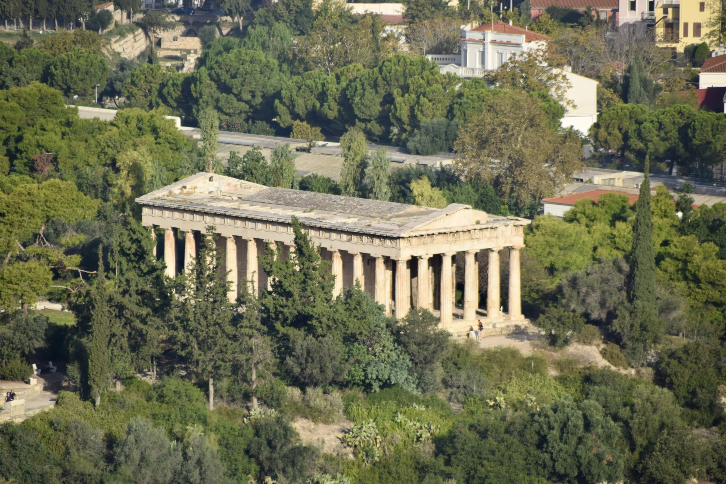 From up here, you can see another temple way down on the ground, the Temple of Hephaestus (Ναός Ηφαίστου), the god of iron working and construction. It was built around the same time as the Parthenon, but is still largely intact due to it having been used as a church and other things for most of its history.