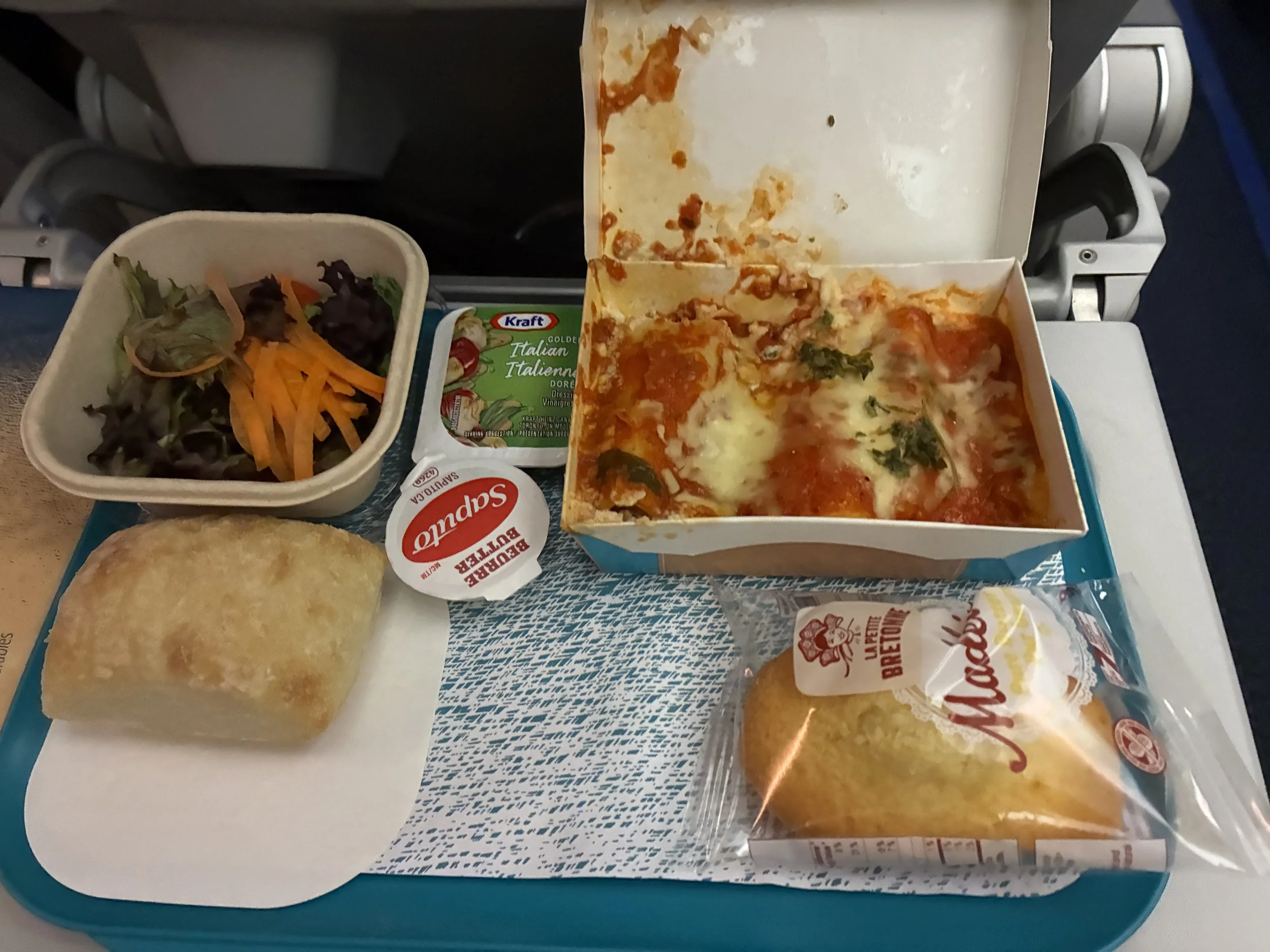 The differences are obvious. In business, you get a plate, actual cutlery, and nicer presentation. In economy, you get a box, wooden utensils, and pre-packaged appearance. But you know what? The food is very similar. The meal was actually really good, the manicotti wasn’t overcooked, and it was just fine. The main difference between business and economy meals isn’t the food, it’s the amount of room you have to eat it. In business, you can eat like a civilized person. In economy, if you’re a tall person, you have to experiment with yoga positions until you find one that allows you to get the little wooden fork full of pasta to your waiting pie hole. It’s awkward AF, but I don’t mind a challenge. And the coffee was good.