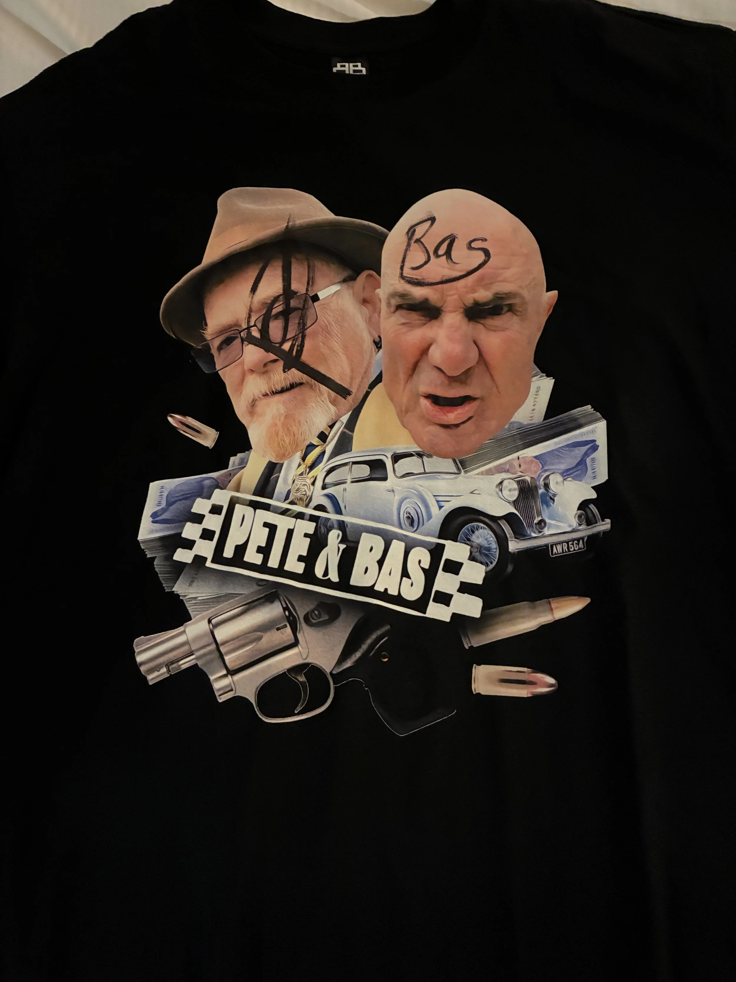Bas introduces me with “this is our mate Jim. He’s come all the way from Canada just to see the show tonight.” The crowd applauds, then starts chanting, “Jim! Jim! Jim!” [that’s surreal, by the way, and I had to resist the urge to hide behind something. I think the crowd sensed my shyness and stopped the chanting fairly quickly]. Bas pointed to my shirt and said, “have a look at this. He’s got the lyrics to “Bish Bash Bosh” printed all over his shirt.