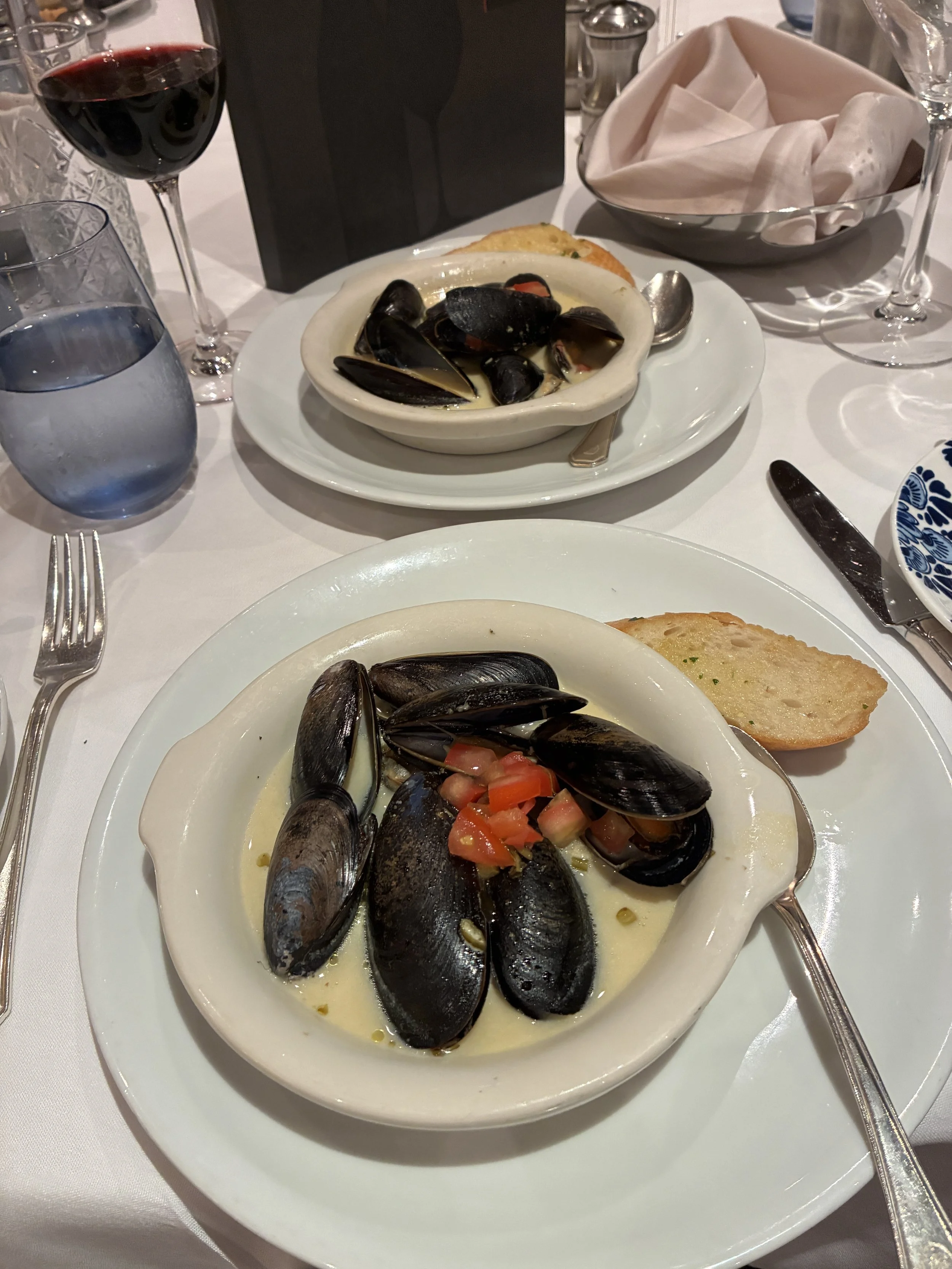 At dinner, they had PEI black mussels. PEI = Prince Edward Island, which is where we’ll be in two days. If you like mussels, PEI are hard to top. I wasn’t the only one who got two orders of them.