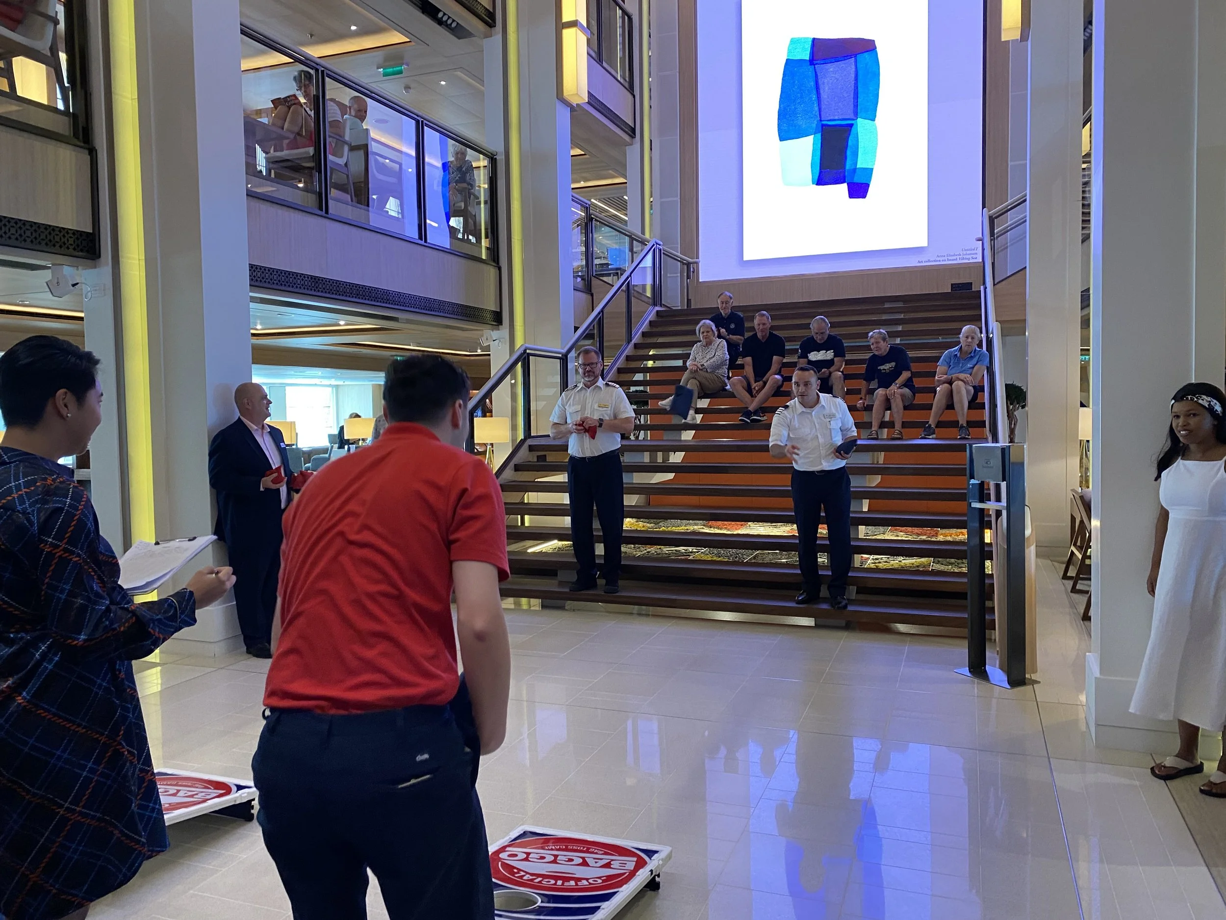 Baggo went well. I adopted the captain’s unusual “reverse claw” throwing style and whaddaya know - scores improved greatly. Got 950 points for the team (!) including two sinkers.