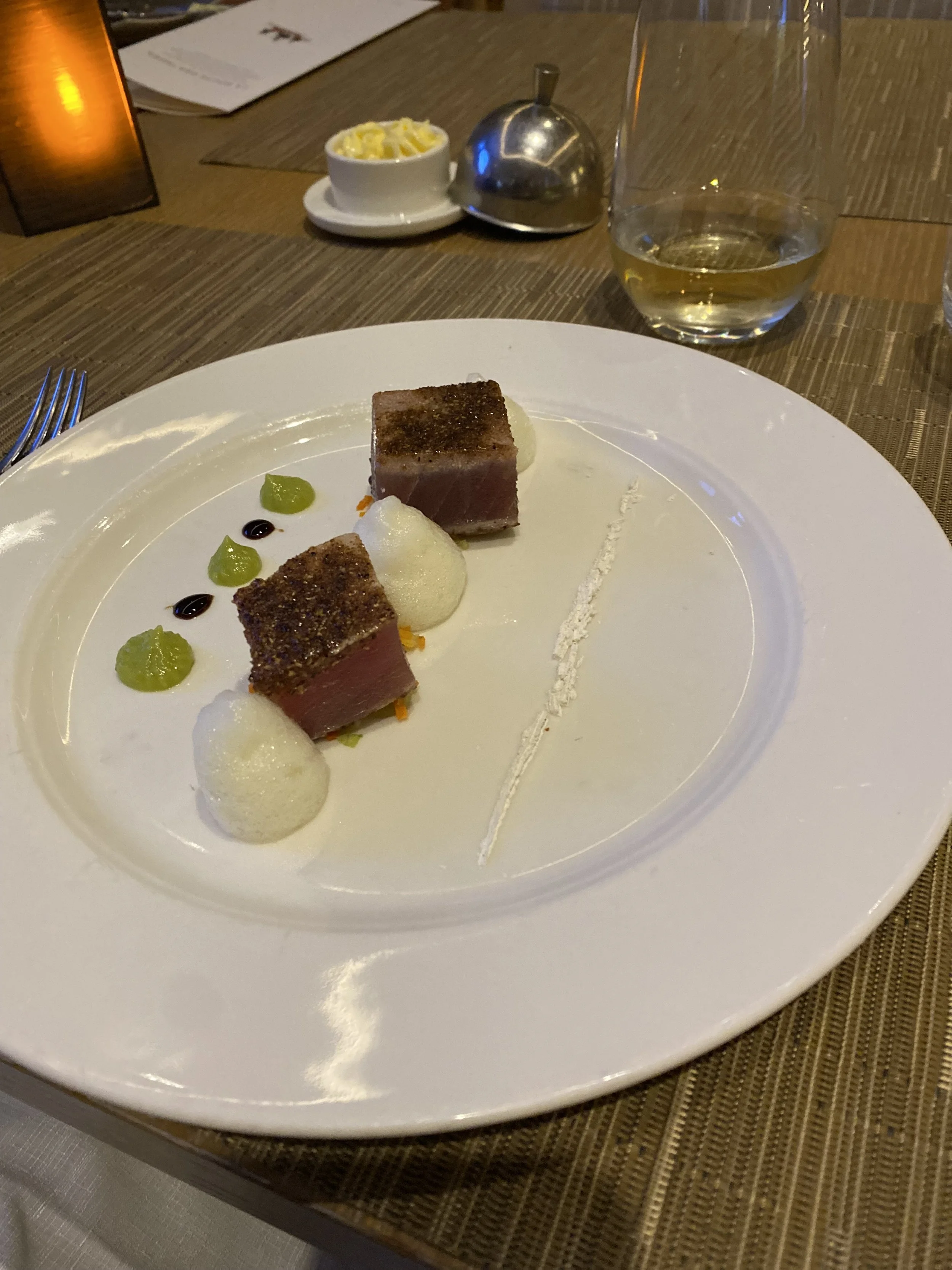 Had dinner with new friend Tom from Palm Springs at the Chef’s Table - the menu was La Route Des Indes (the road to India), but it wasn’t about butter chicken or saag aloo. The amuse bouche was a carrot/cardamom chilled soup, then the first course was spicy tuna tataki.
