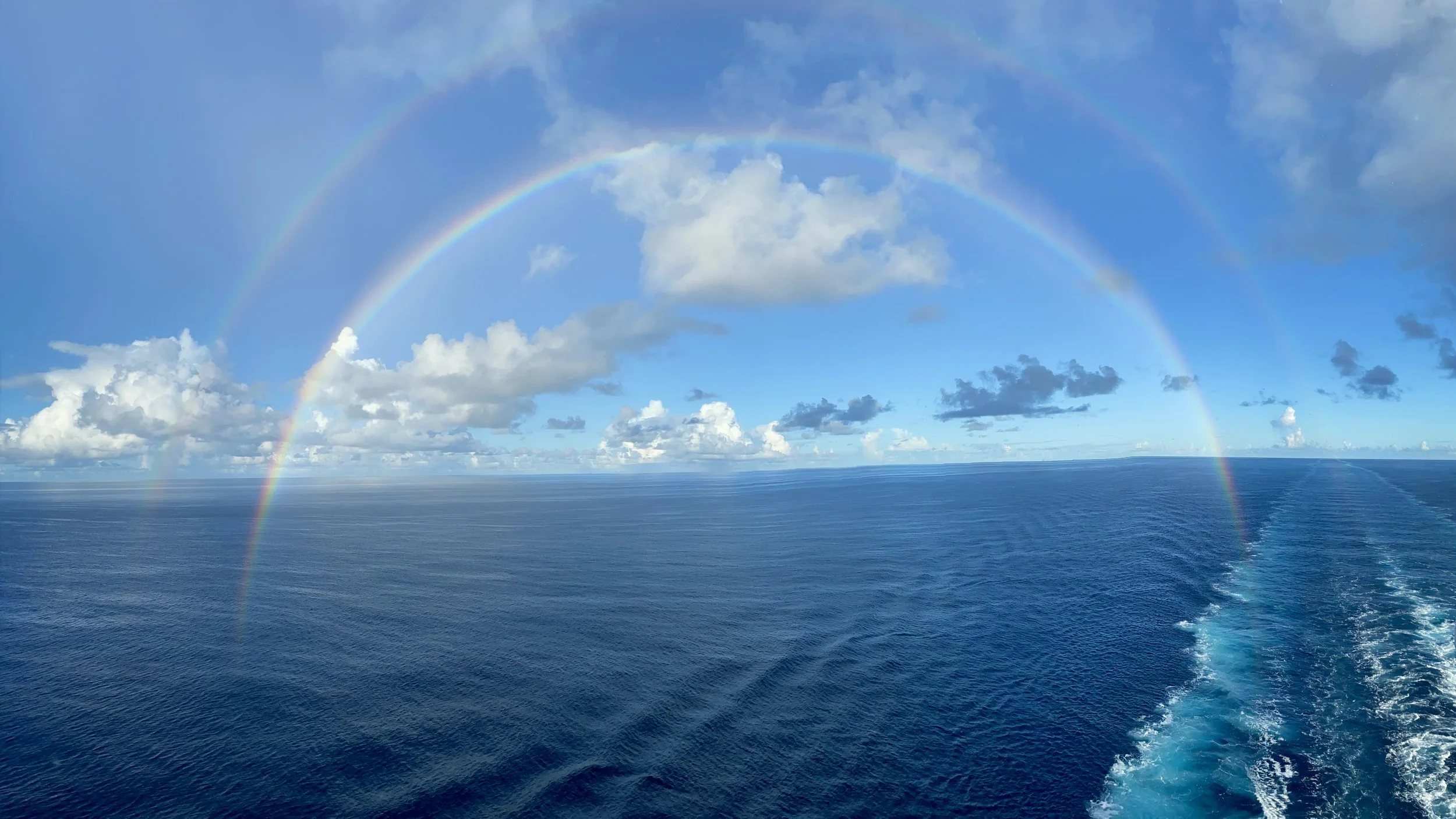 I mentioned several days ago that I’d only ever seen a complete rainbow two or three times before. Well, this morning had another one, only it was a double. Very nice! (the horizon line is a little wonky, as I was doing a panoramic photo while standing on a moving ship)