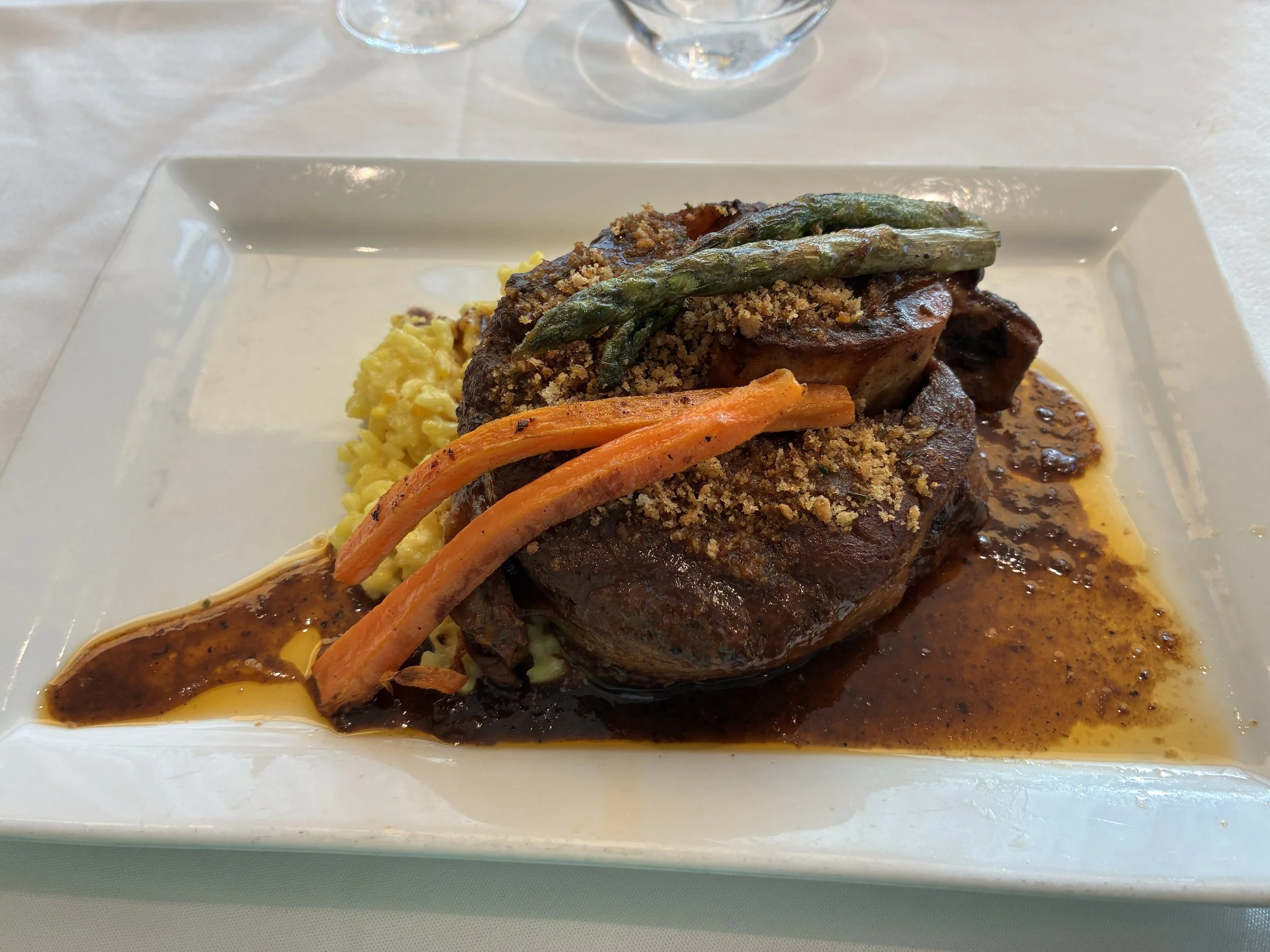 It sat on a bed of cheesy risotto and was accompanied by grilled carrots and asparagus. And even though it took me at least a half-dozen osso bucco before I was able to get past the ‘ick factor’ of having the jellied bone marrow at the centre of the dish, I was well past all that and I happily mixed it in with the cheesy risotto and it was OMG delicious.