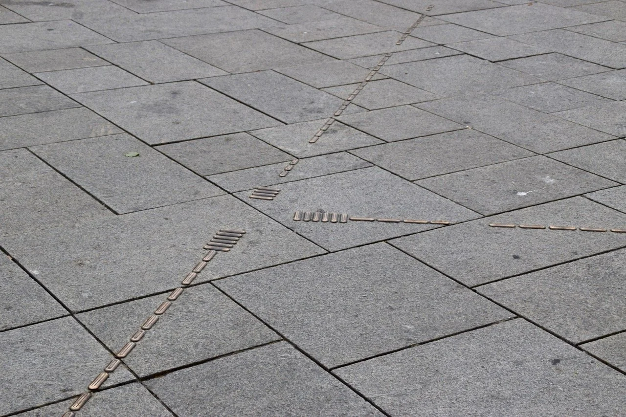 Interestingly, when the pavement opens up into a plaza, they install raised metal guides for blind people to navigate across the plaza and end up on the street they want. The dashes have insets in them of various sizes and the placement of them has some meaning as well, kinda like Morse code.
