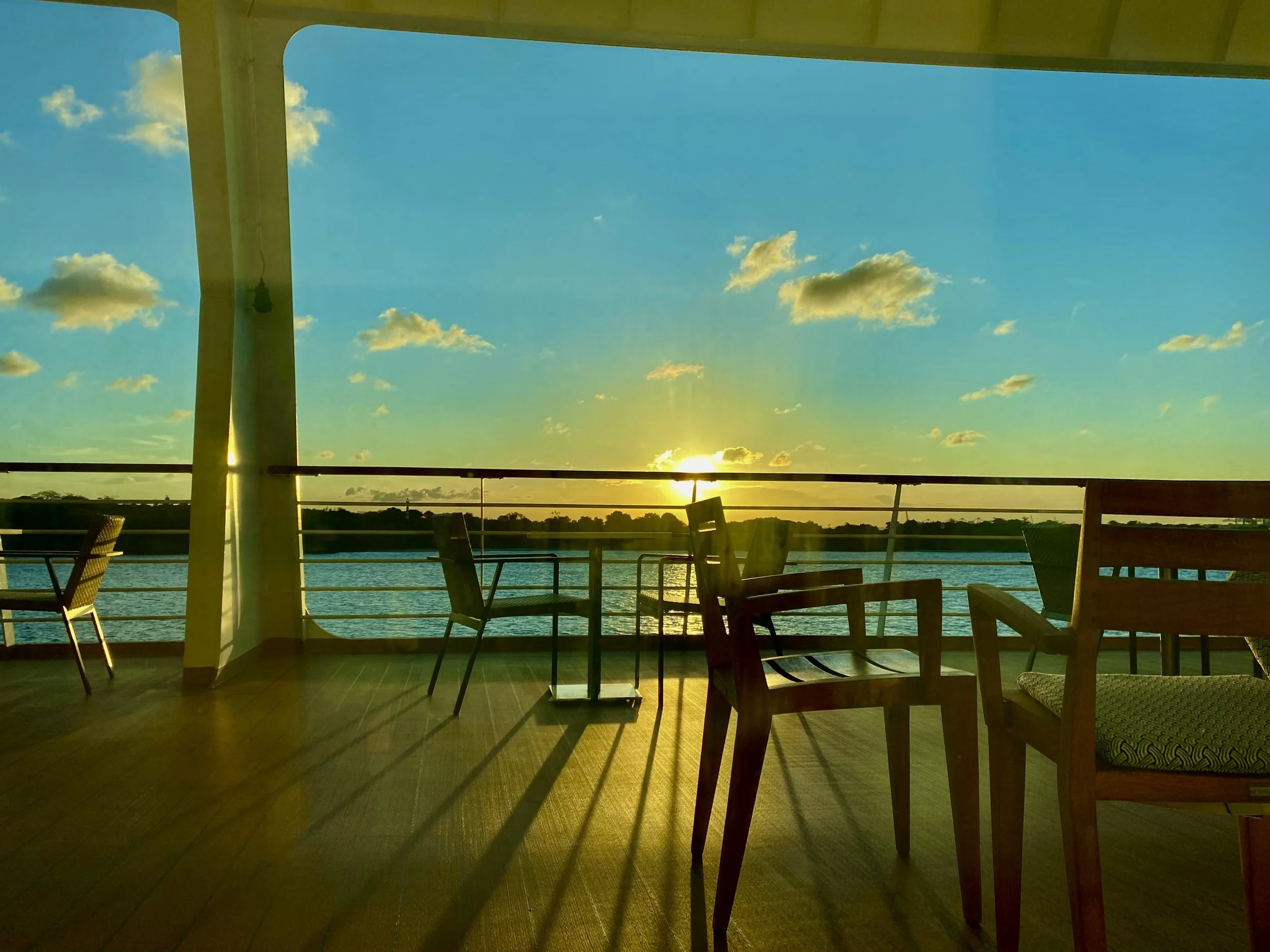 Dinner was interesting. We got our favourite table, with a view out the back of the ship, and caught the sunset as we left Kenya. The windows of the restaurant are tinted a bit, which cast an unusual greenish tint to the sunset, but it was still pretty.