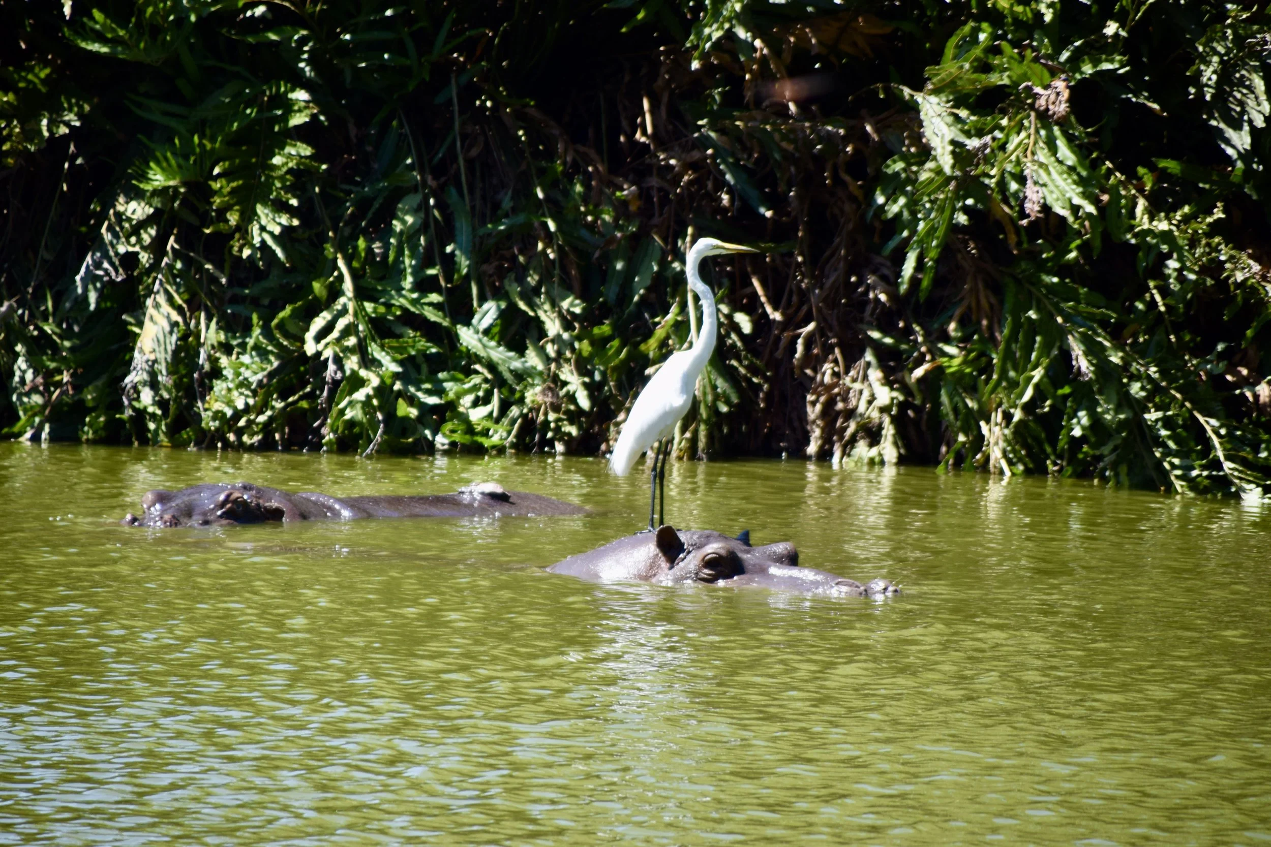 A bit farther, and we came to a very large enclosure with a big pond in the middle. A couple of hippos were hanging out there, chilling out in the water, one with a bird on his head.