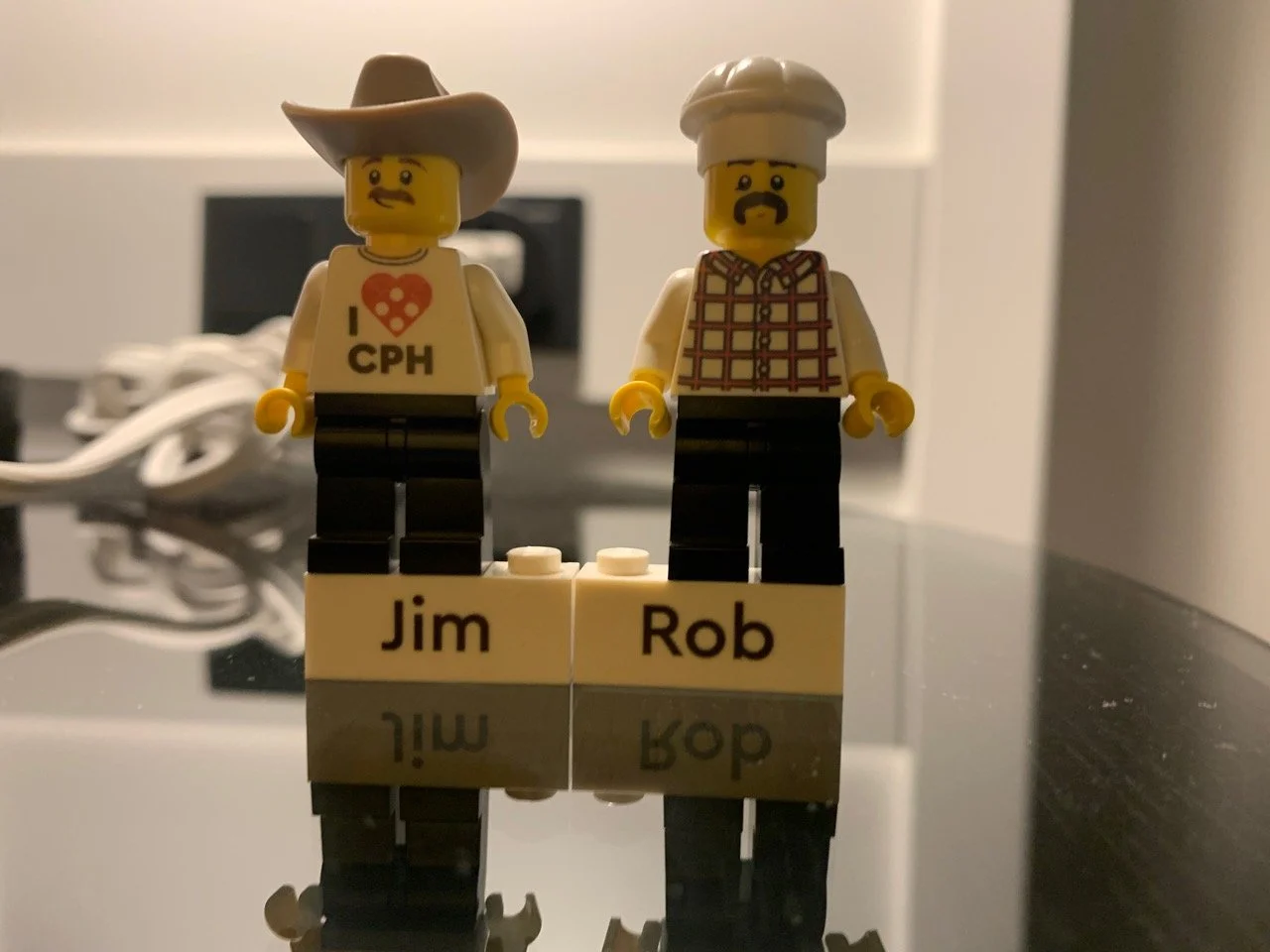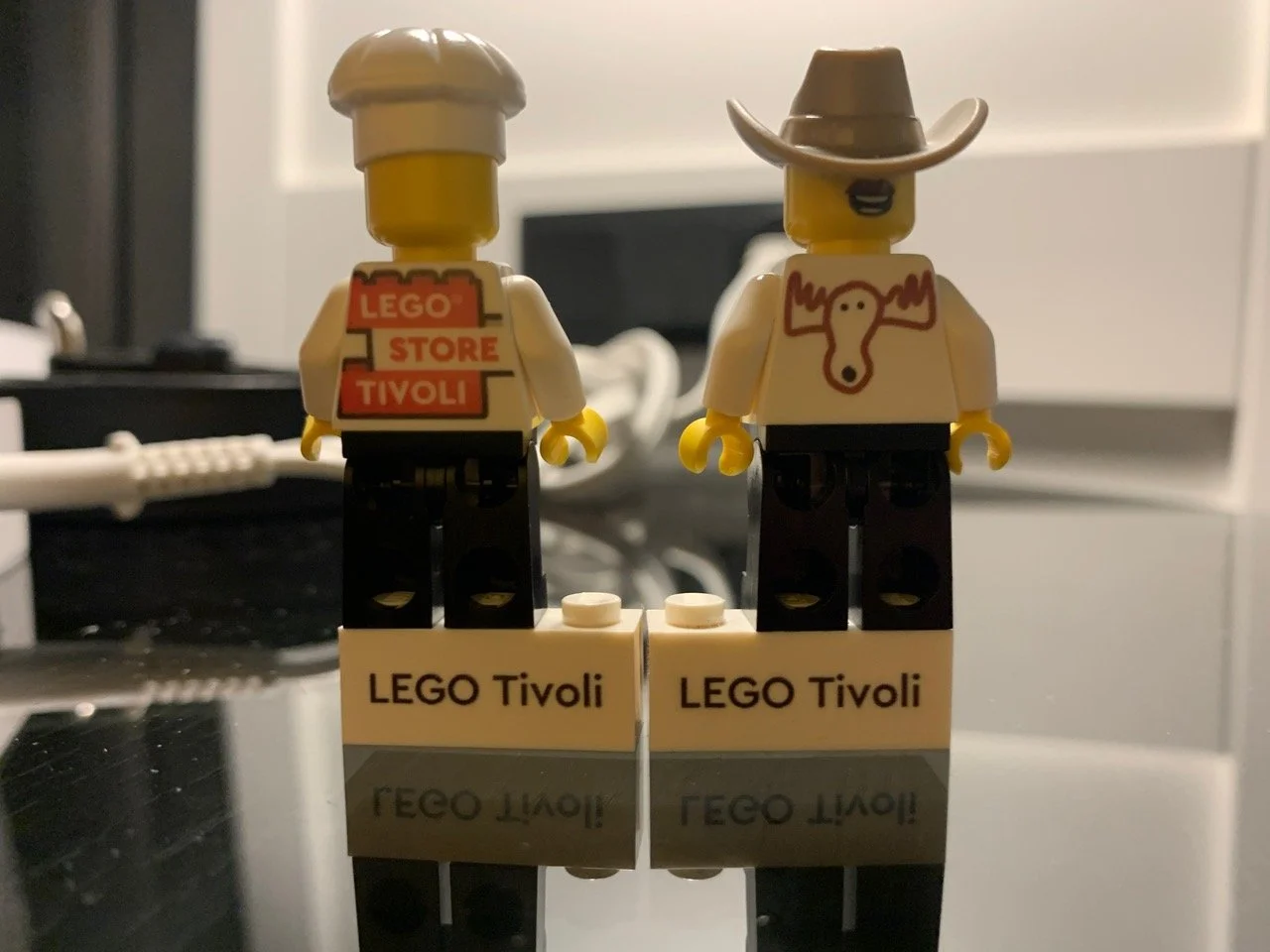 They had limited faces and such, which is why Rob looks kinda like a member of the Village People. I drew a moose on the back of my shirt and Rob has Lego Store Tivoli on his.