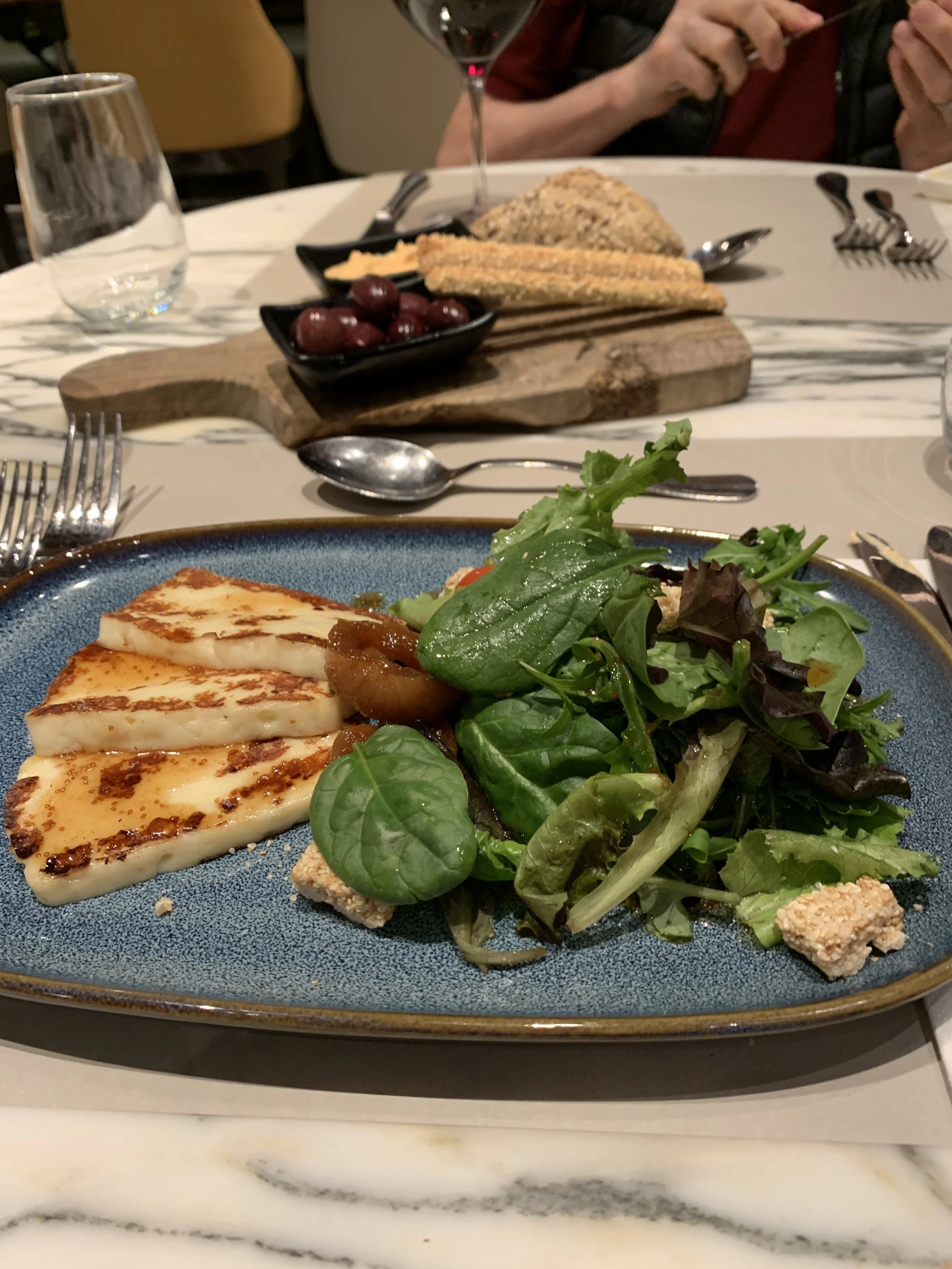 Back at the hotel, we both crashed pretty hard for a long nap, because jet lag. Then it was dinner at Made in Athens, the hotel restaurant. I started off with grilled halloumi (goat/sheep cheese), figs, and salad drizzled with honey. Delicious.