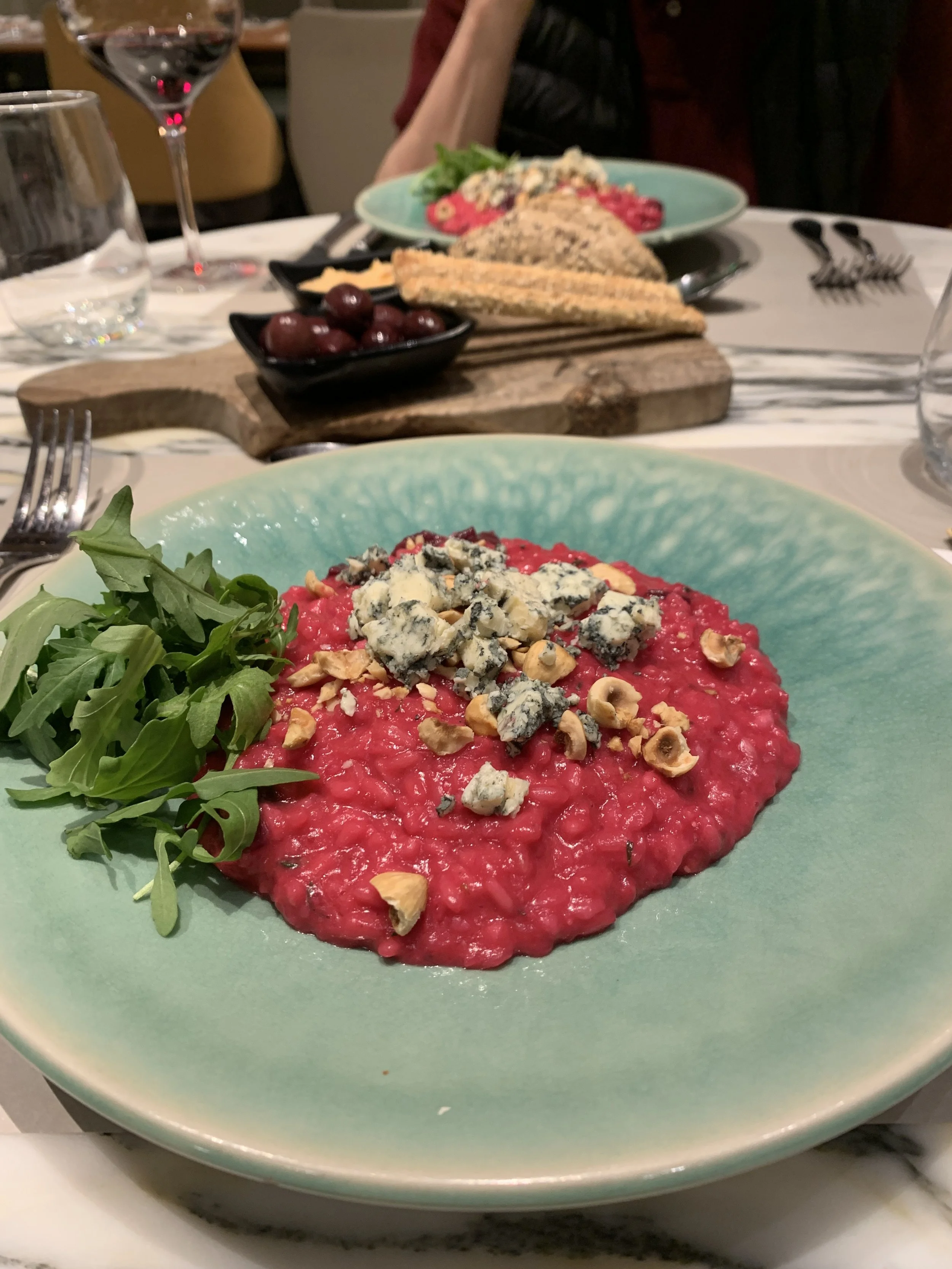For the main, we both had beet risotto topped with blue cheese and toasted hazelnuts. Really, really good. It’s not often that I eat pink food for dinner, nor do I normally eat vegetarian, but here we are.