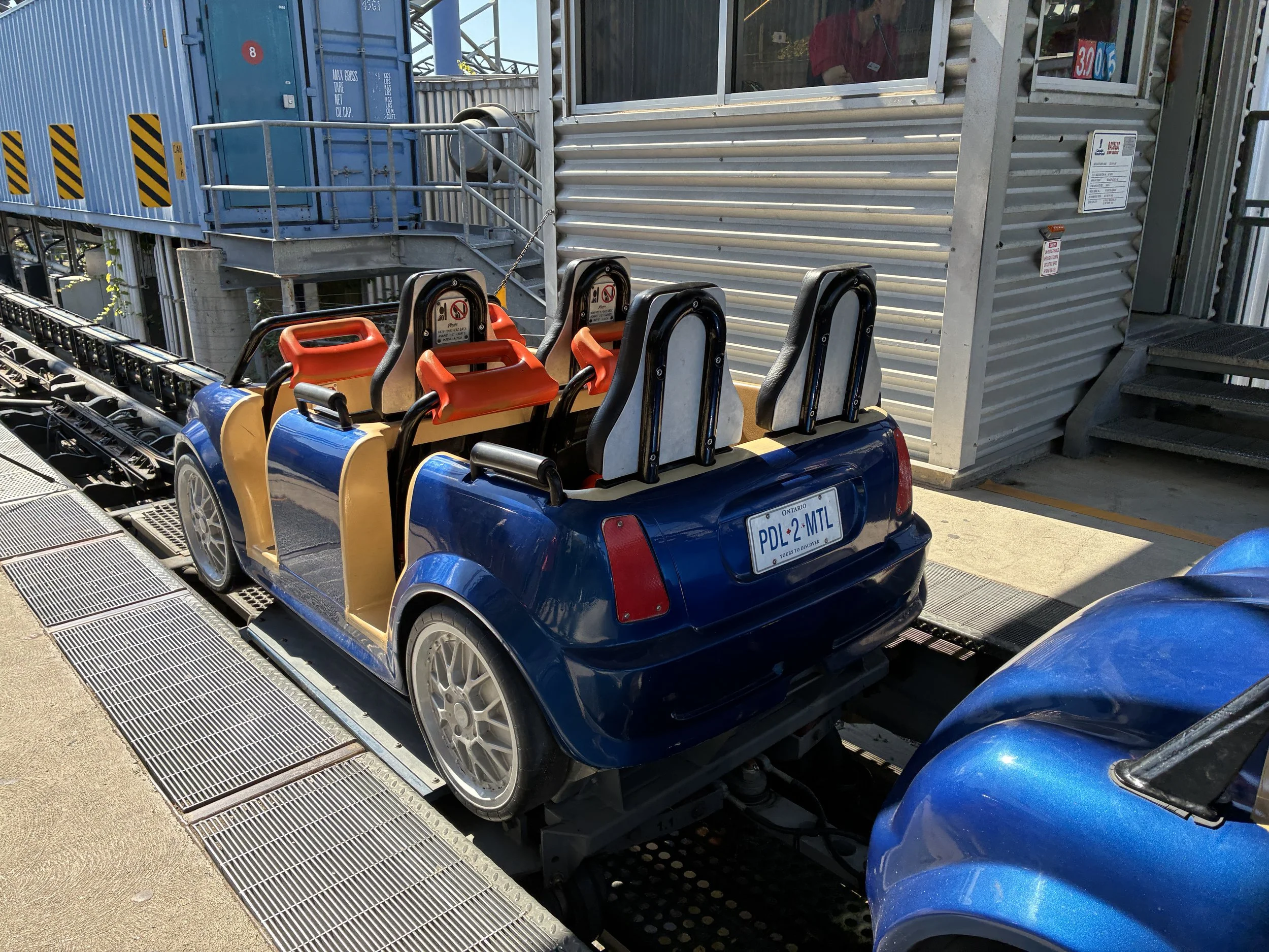 The proof of this newfound intensity came right at the very end, when the cars get to the final brake run. The lead car has always swung pretty high here, but today it was slamming the swing stops (bumpers to keep the cars from over swinging) coming in…