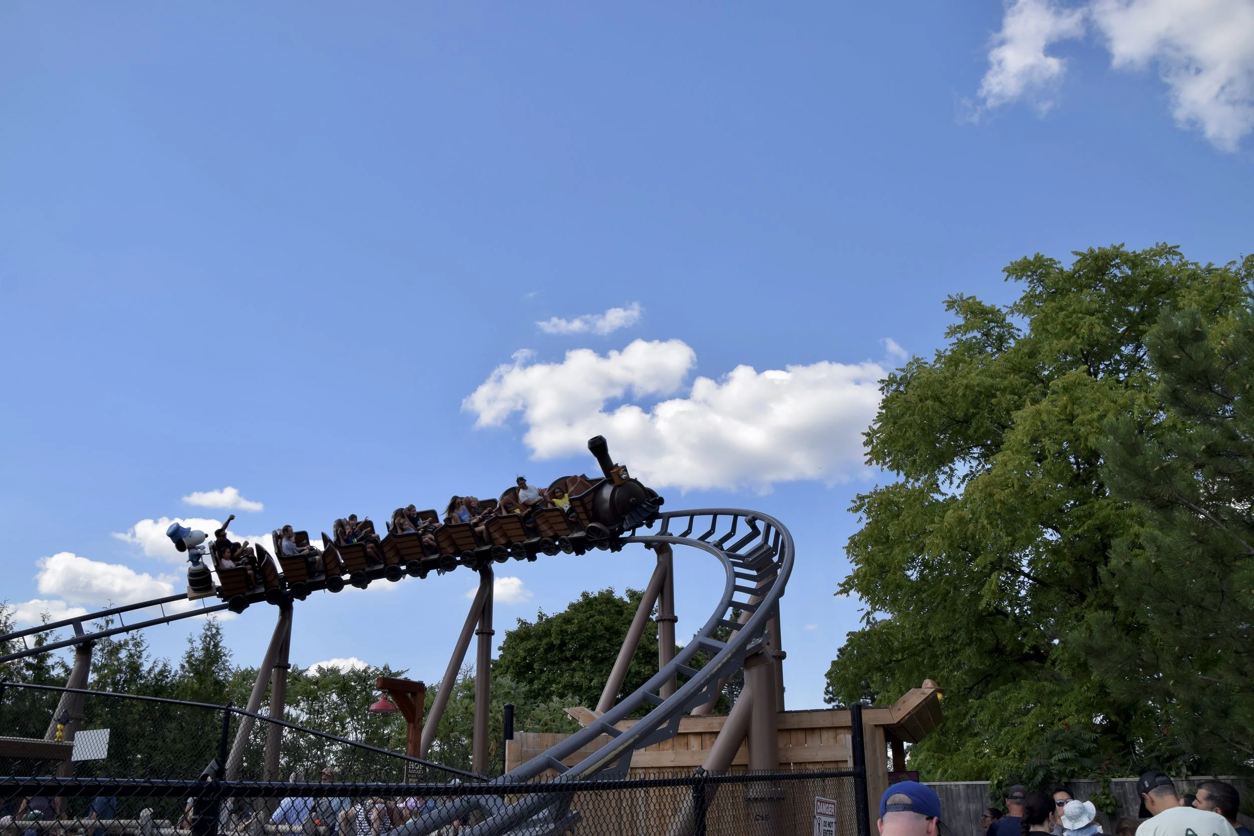 It’s a dual-launched family-sized coaster with a cute storyline: Snoopy’s train is being robbed by a gang of moustachioed Woodstocks and RCMP Charlie Brown saves the day. I never thought I’d see Chuck as a Mountie, but here we are.